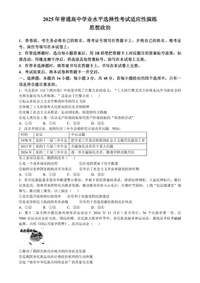 山西、陕西、宁夏、青海2025年1月八省联考政治试题及答案