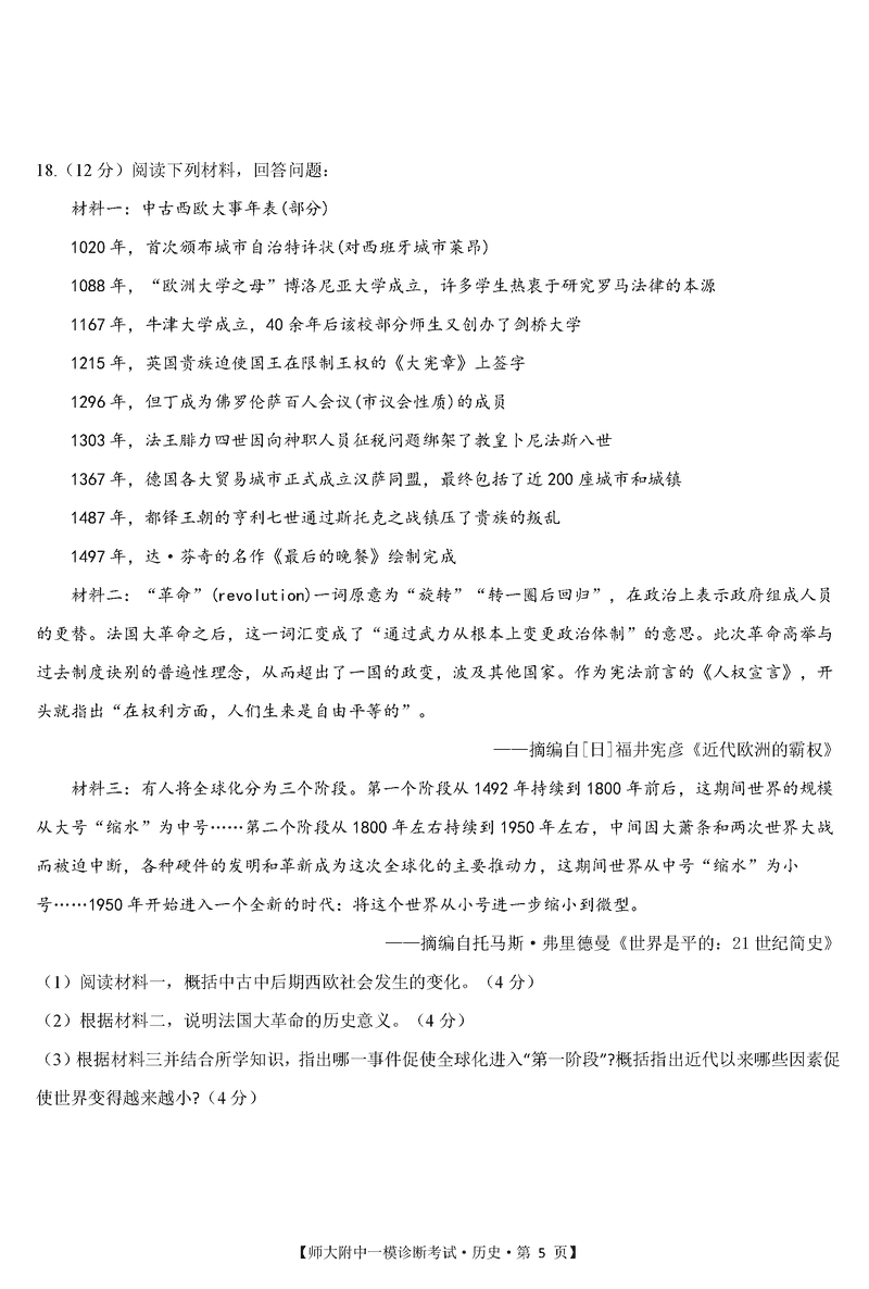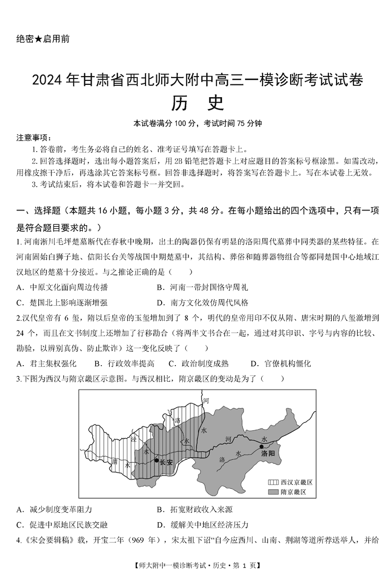 甘肃西北师大附中2025届高三上学期一模历史试题及答案