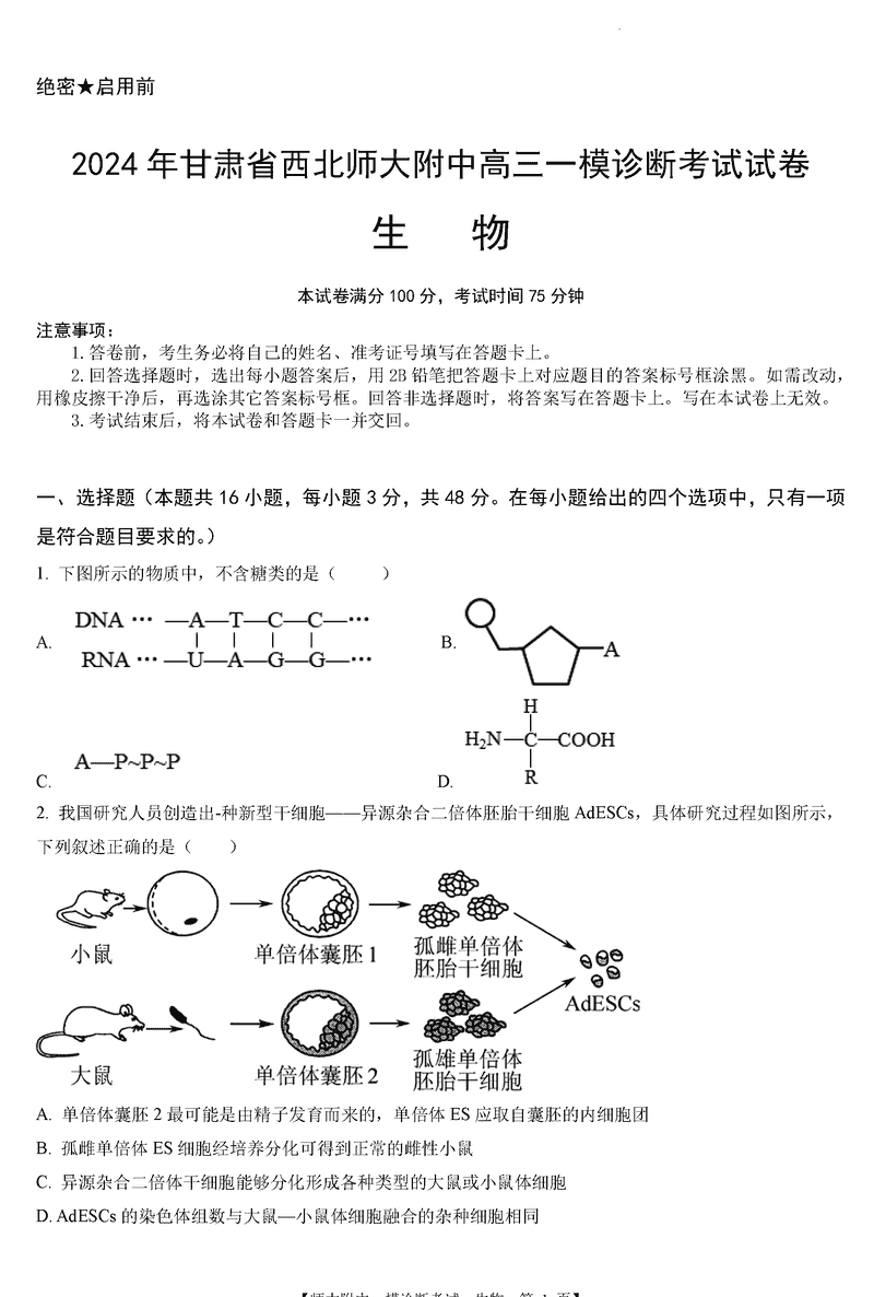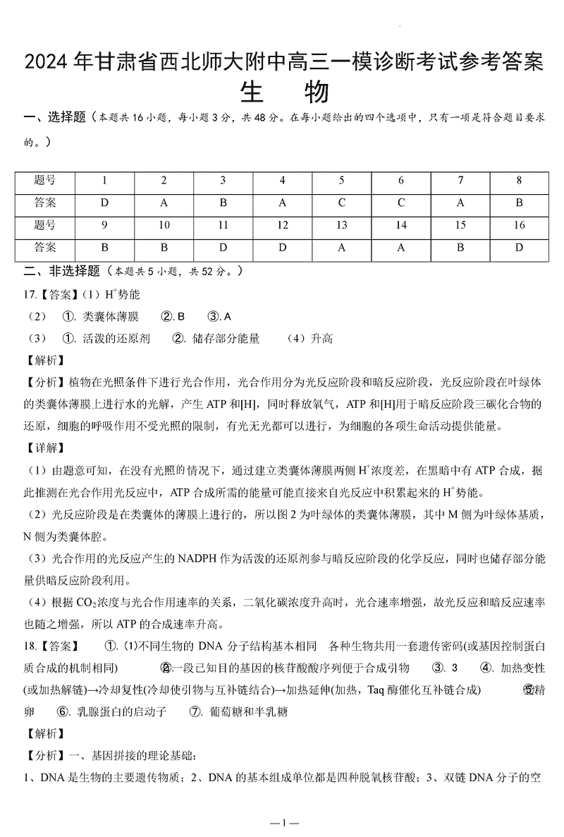 甘肃西北师大附中2025届高三上学期一模生物考试已于近日开考,为方便考生考后及时查看考试情况,查漏补缺、弥补不足,本文整理了试题答案解析相关信息!