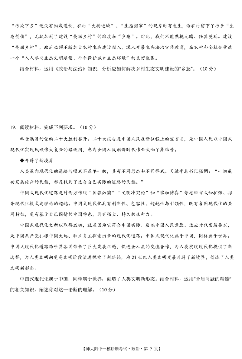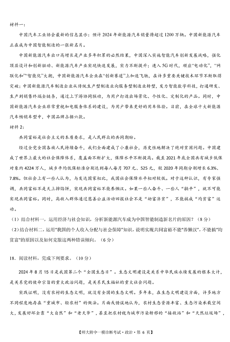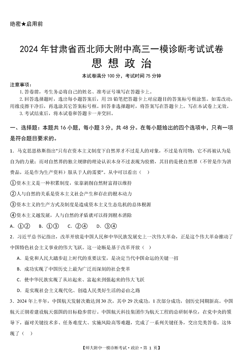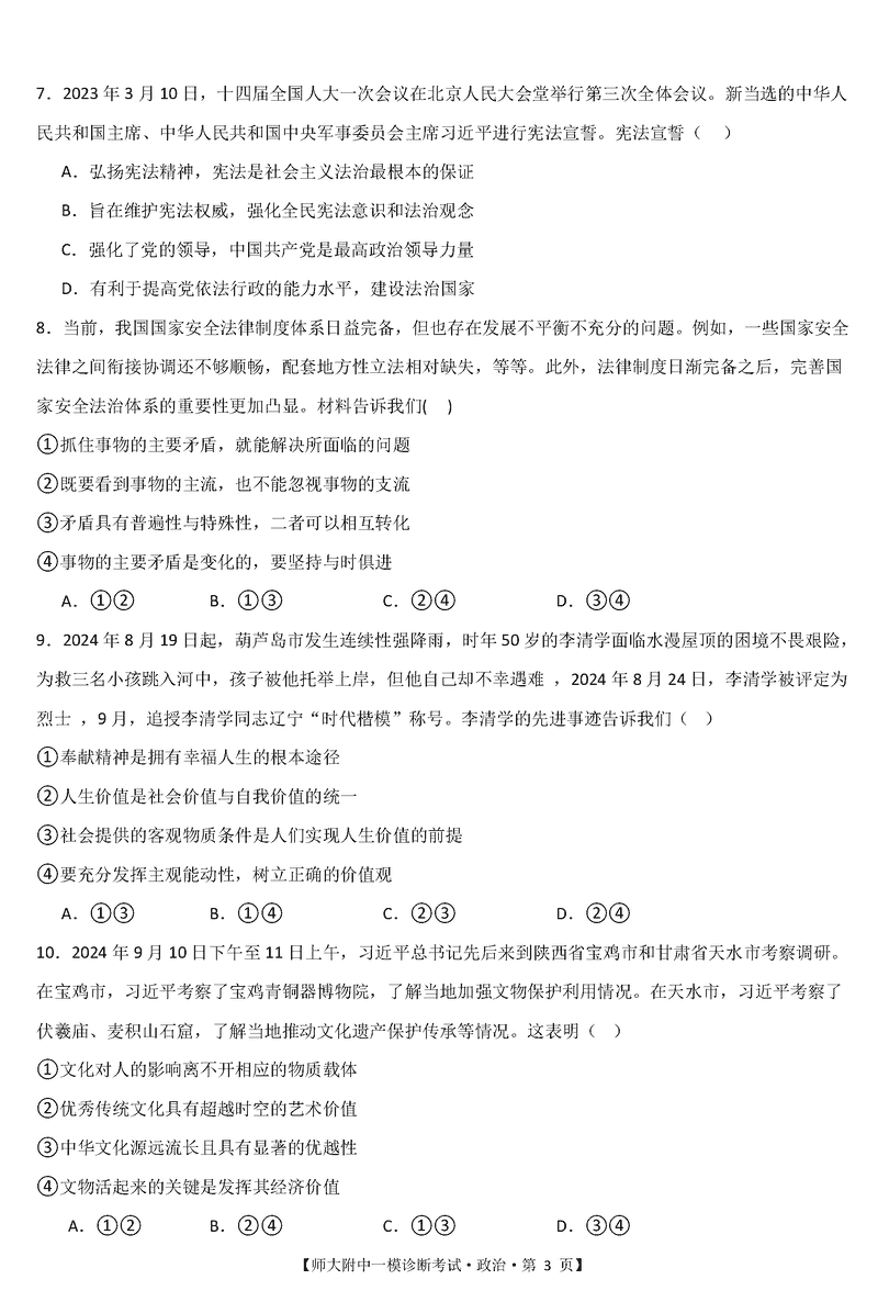 甘肃西北师大附中2025届高三上学期一模政治试题及答案