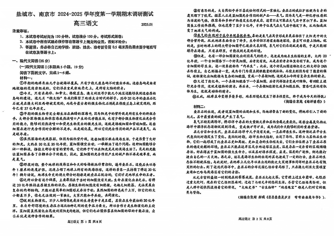 南京市、盐城市2025届高三上学期期末一模语文试题及答案