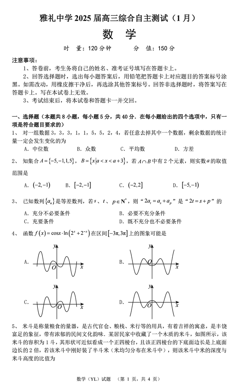 湖南雅礼中学2025届高三上学期1月期末综合自主测试数学考试已于近日开考,为方便考生考后及时查看考试情况,查漏补缺、弥补不足,本文整理了试题答案解析相关信息!