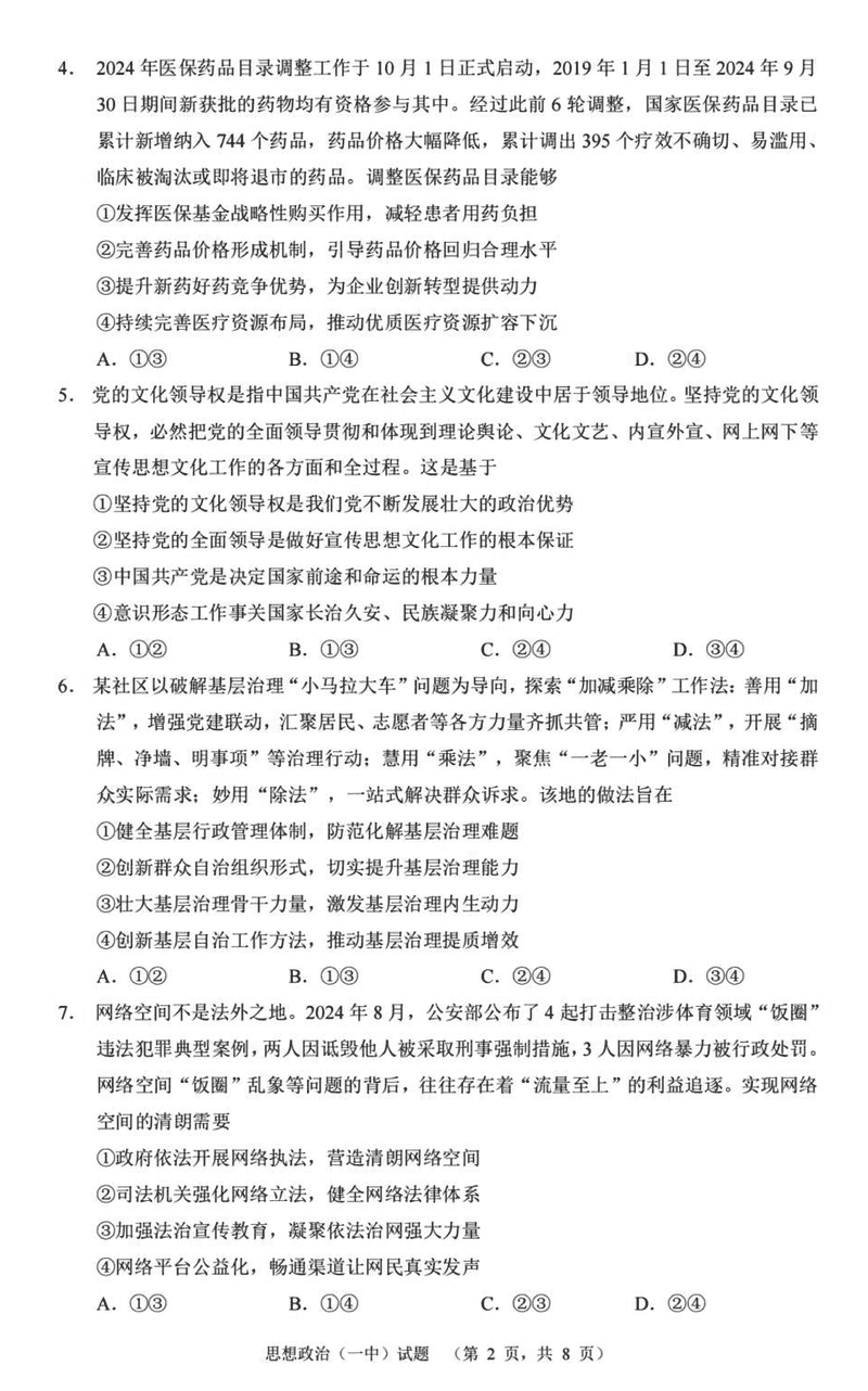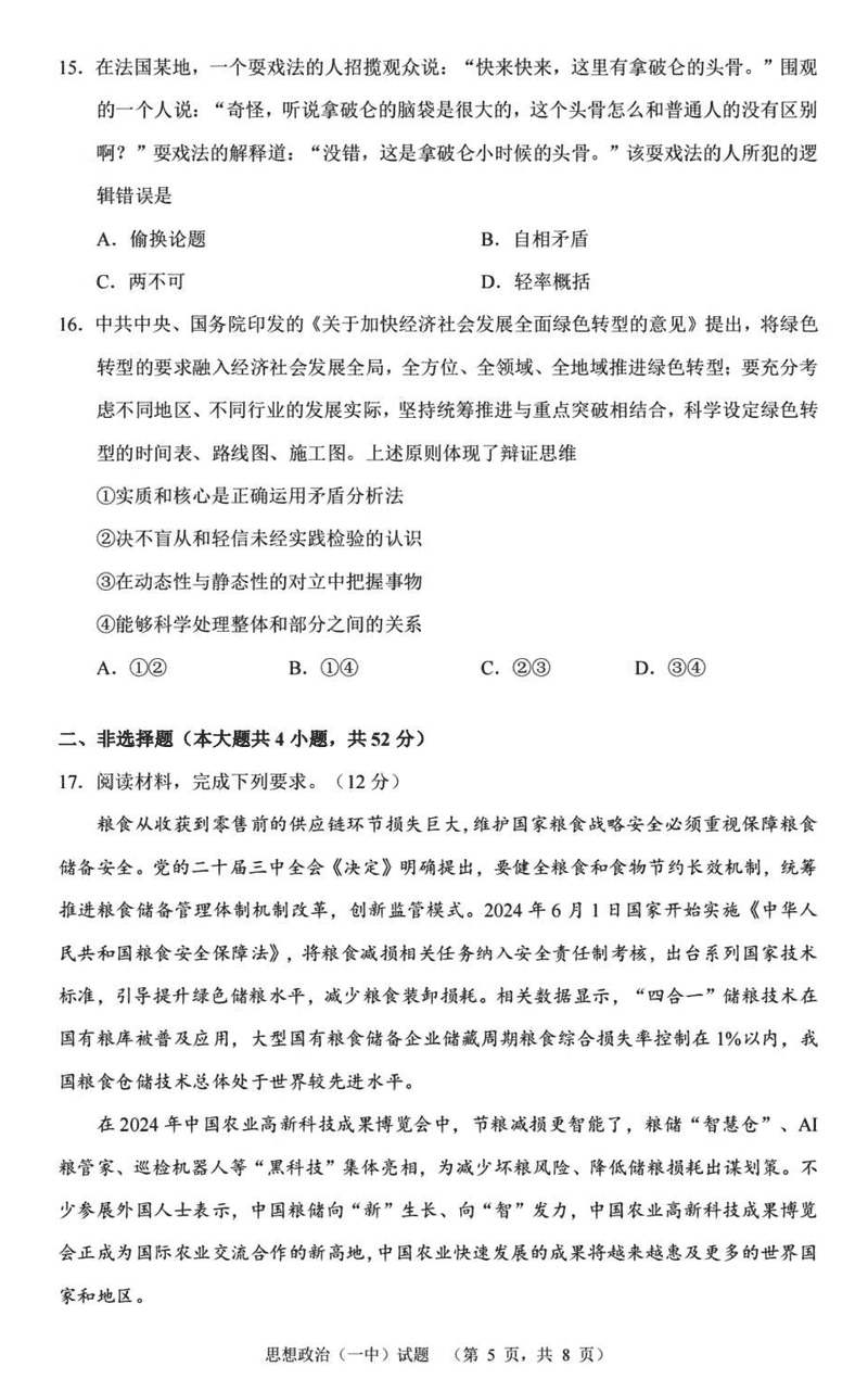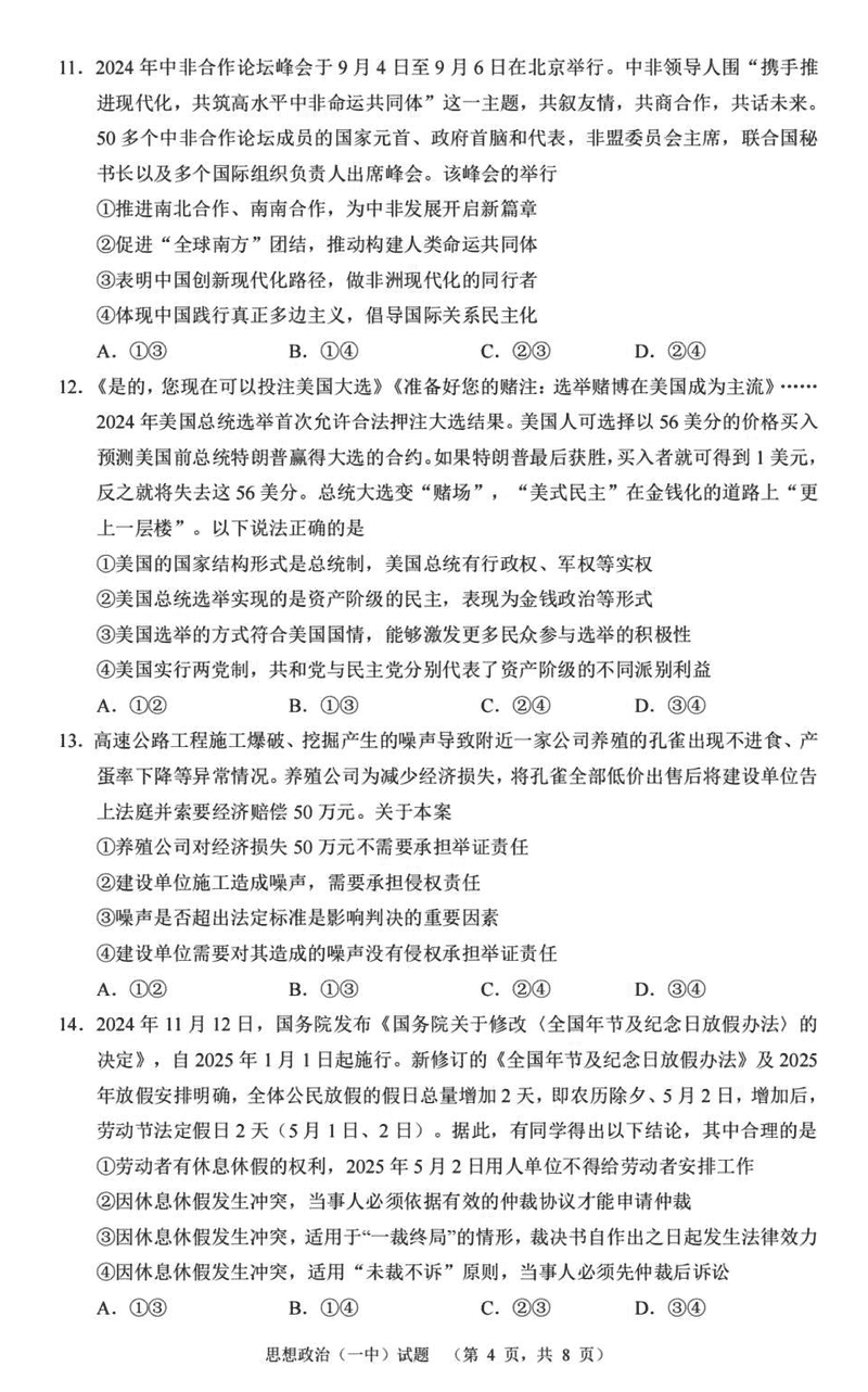 湖南长沙一中2025届高三上学期阶段性检测(五)政治试题及答案