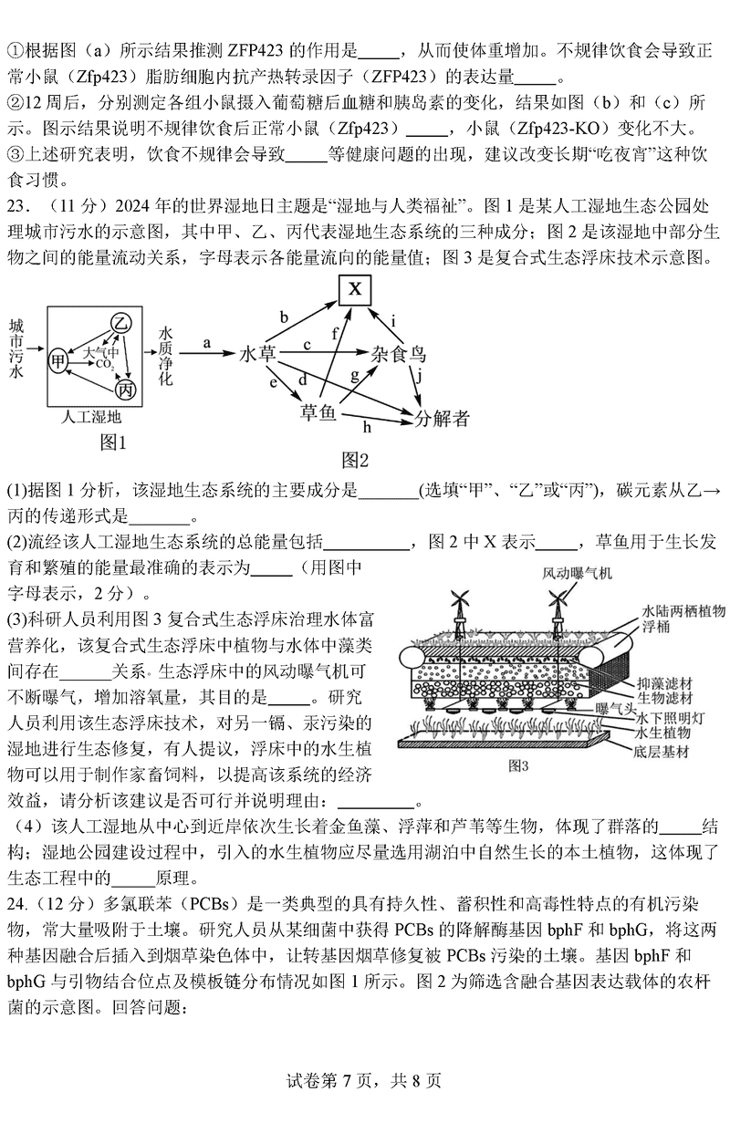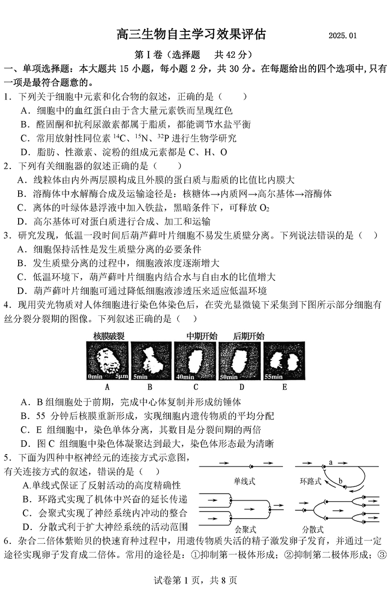 江苏扬州中学2025届高三上学期1月自主评估生物试题及答案