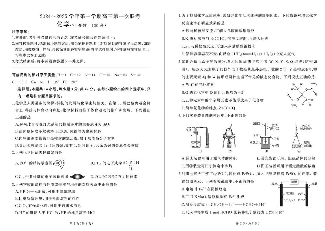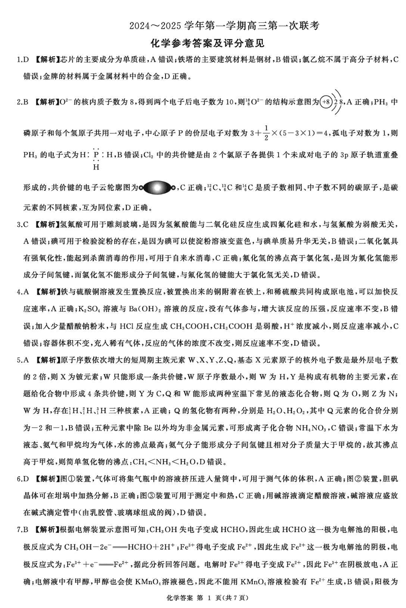 甘肃省部分学校2025届高三上学期第一次联考化学试题及答案