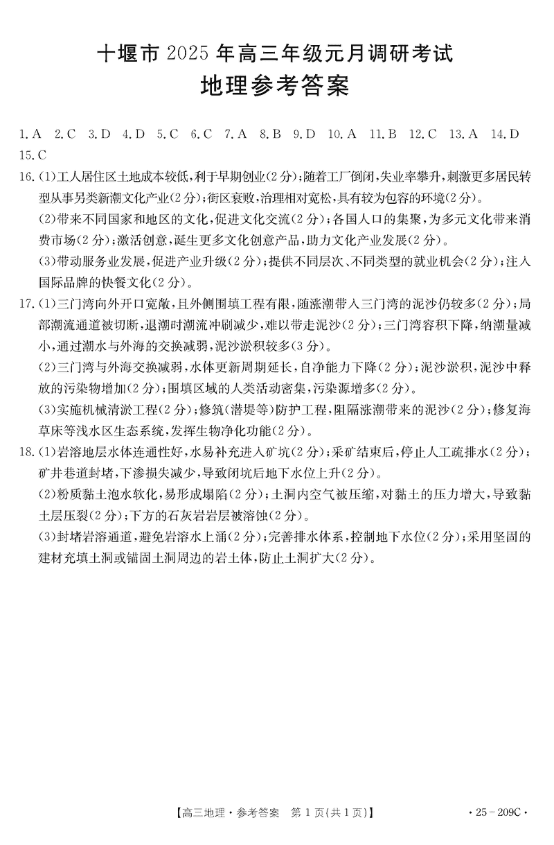 湖北十堰2025届高三元月调研地理试题及答案