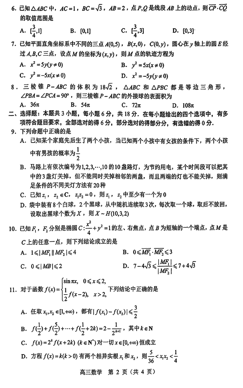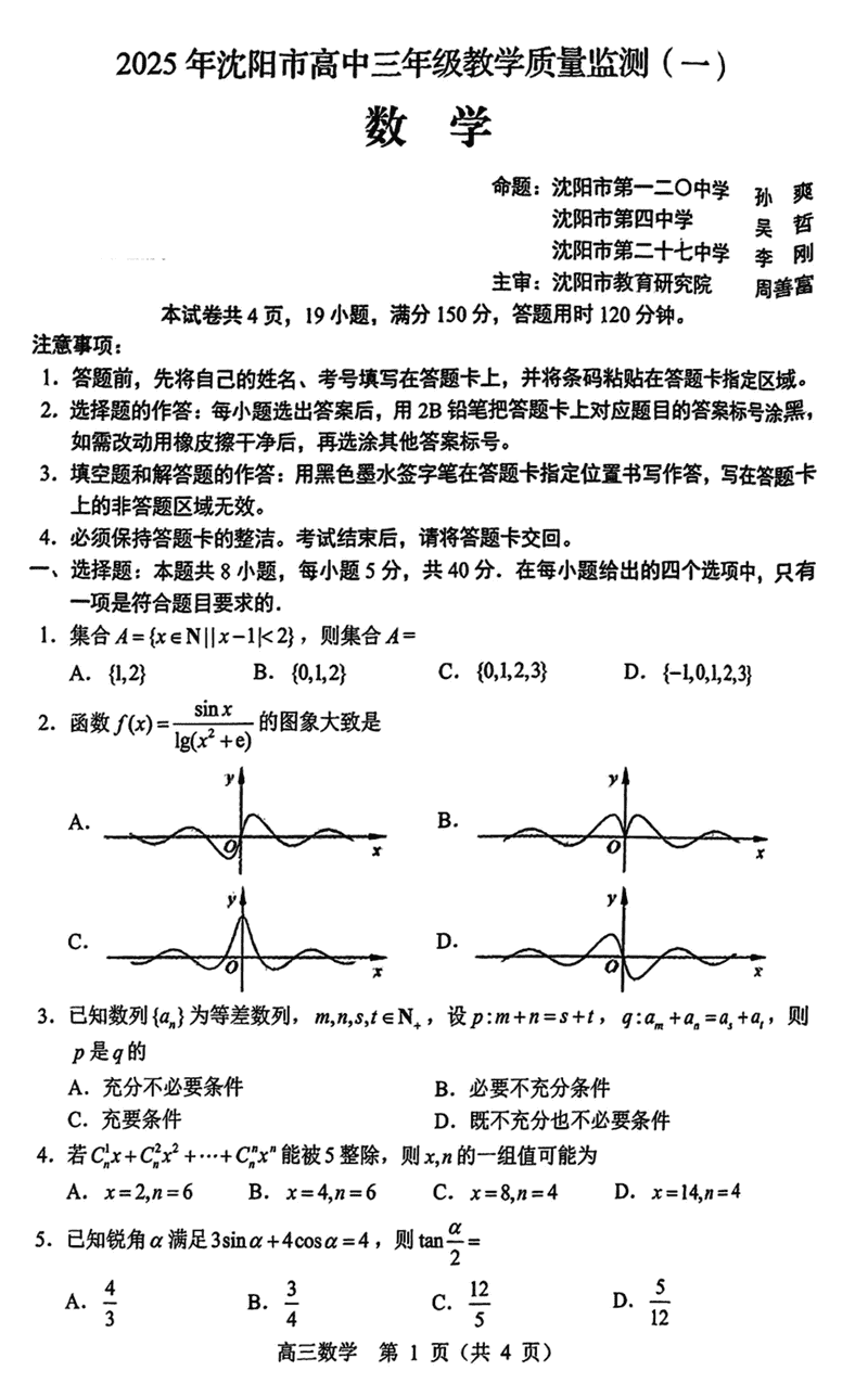沈阳2025届高三上学期教学质量监测(一)数学试题及答案