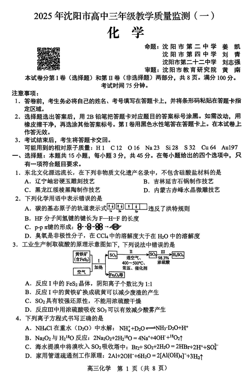 沈阳2025届高三上学期教学质量监测(一)化学试题及答案