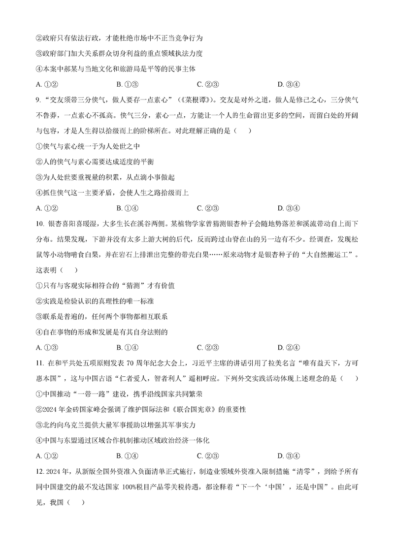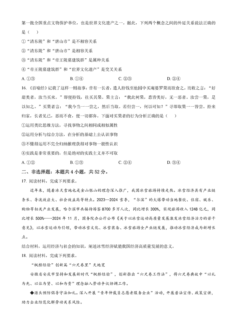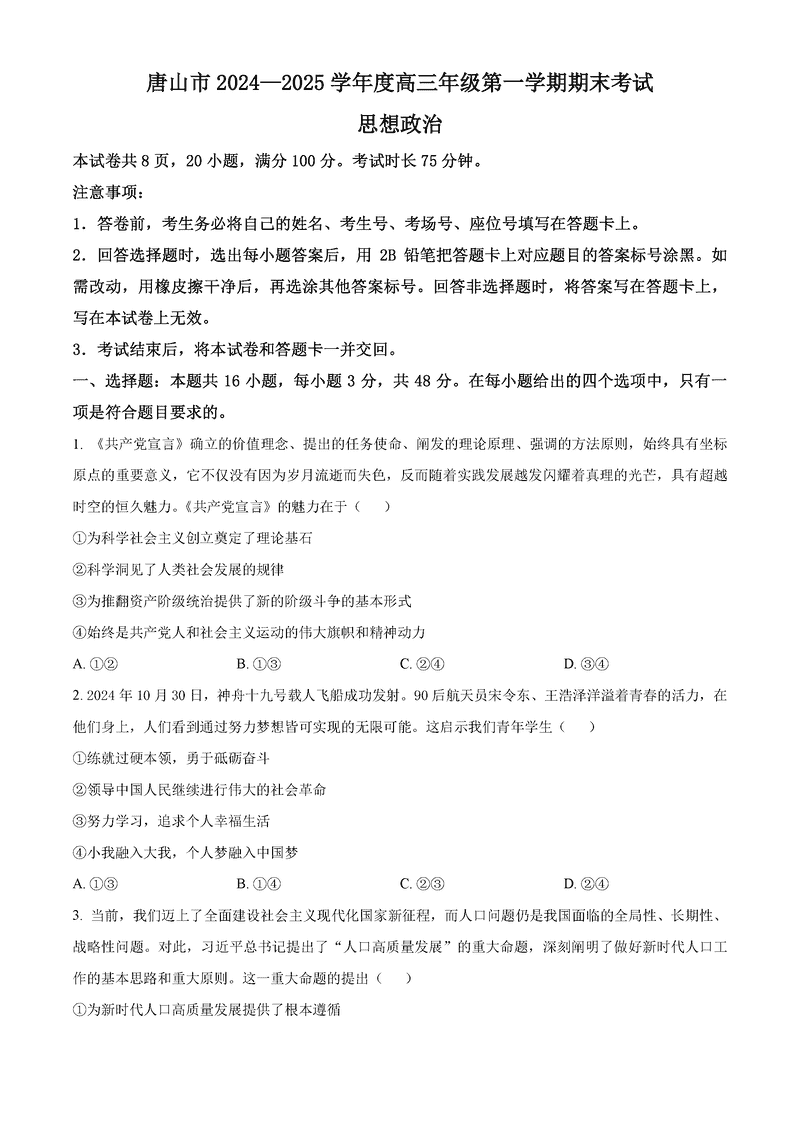 河北唐山2024-2025学年高三上学期1月期末政治试题及答案