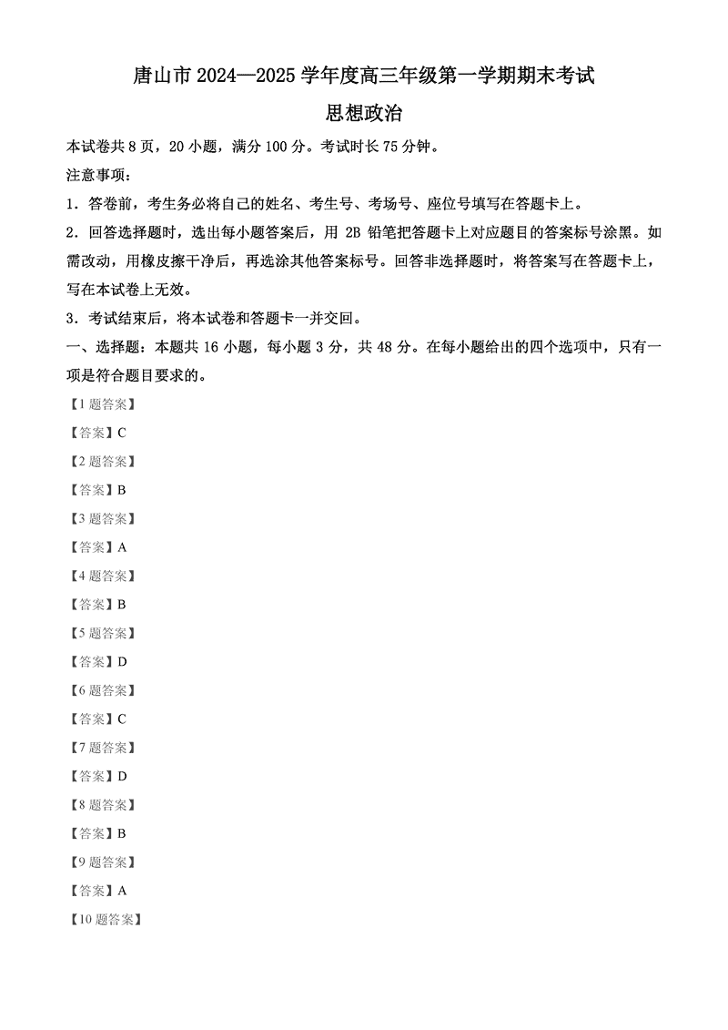 河北唐山2024-2025学年高三上学期1月期末政治考试已于近日开考,为方便考生考后及时查看考试情况,查漏补缺、弥补不足,本文整理了试题答案解析相关信息!