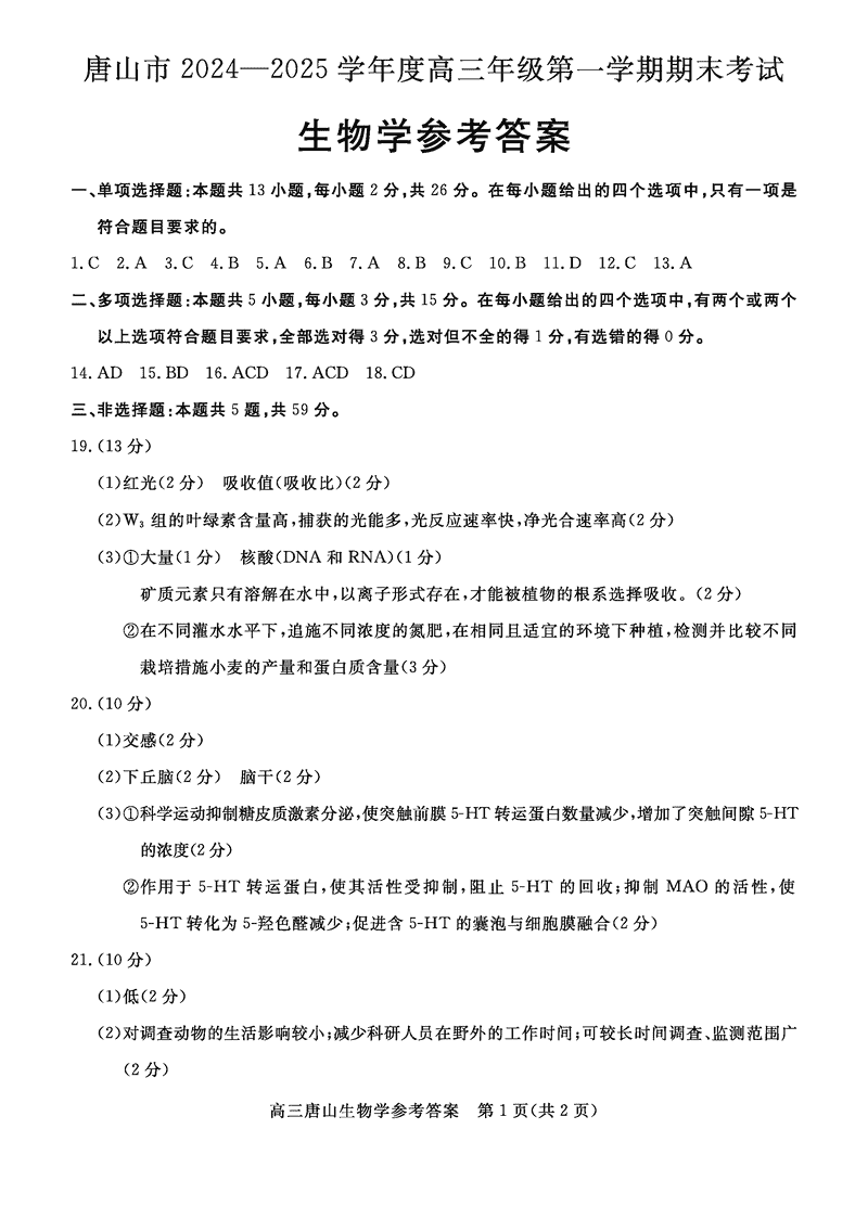 河北唐山2024-2025学年高三上学期1月期末生物考试已于近日开考,为方便考生考后及时查看考试情况,查漏补缺、弥补不足,本文整理了试题答案解析相关信息!