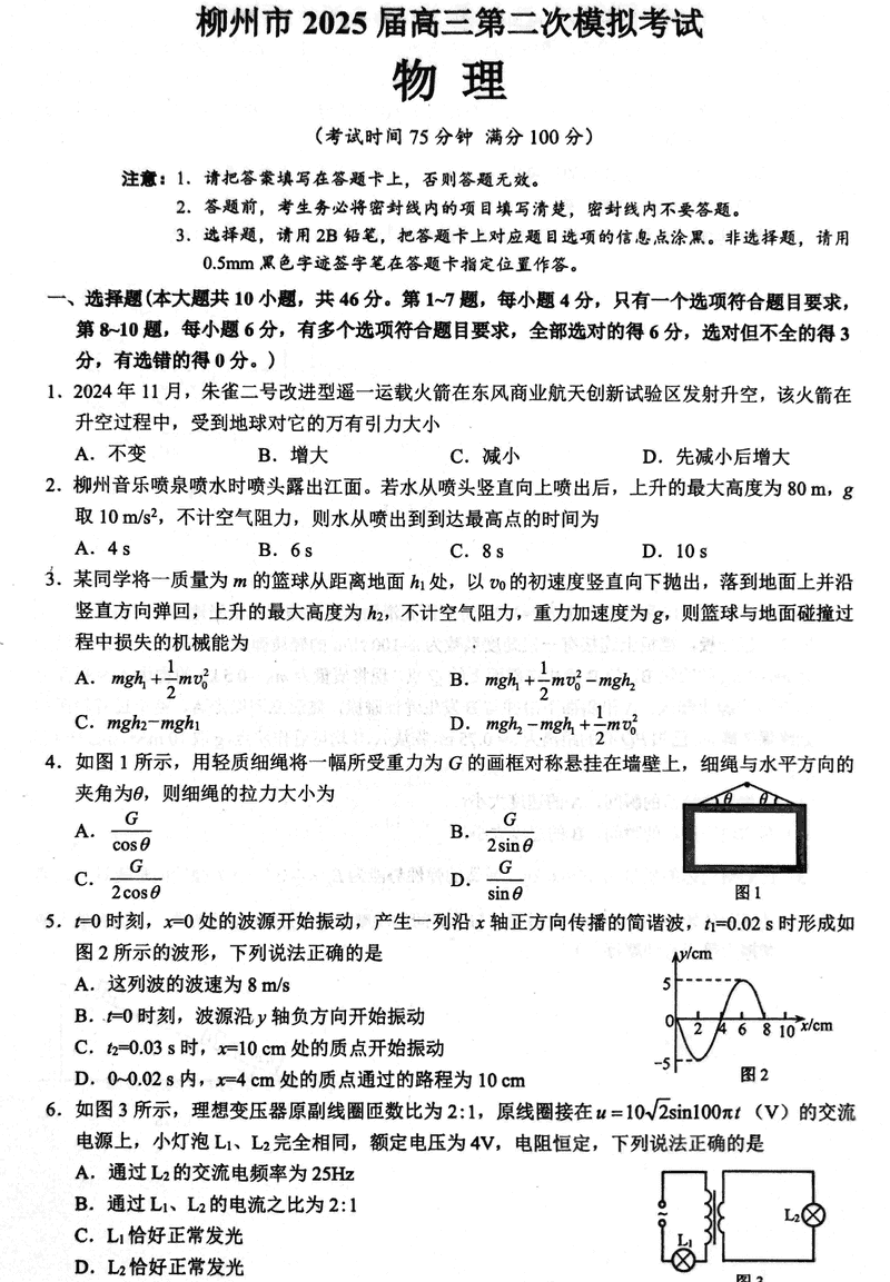 广西柳州市2025届高三第二次模拟考物理试题及答案 时间:2025-01-12 广西 理综试题 广西柳州市2025届高三第二次模拟考物理考试已于近日开考,为方便考生考后及时查看考试情况,查漏补缺、弥补不足,本文整理了试题答案解析相关信息! 汇总:广西柳州市2025届高三第二次模拟考试试题及答案汇总 物理试题及答案解析