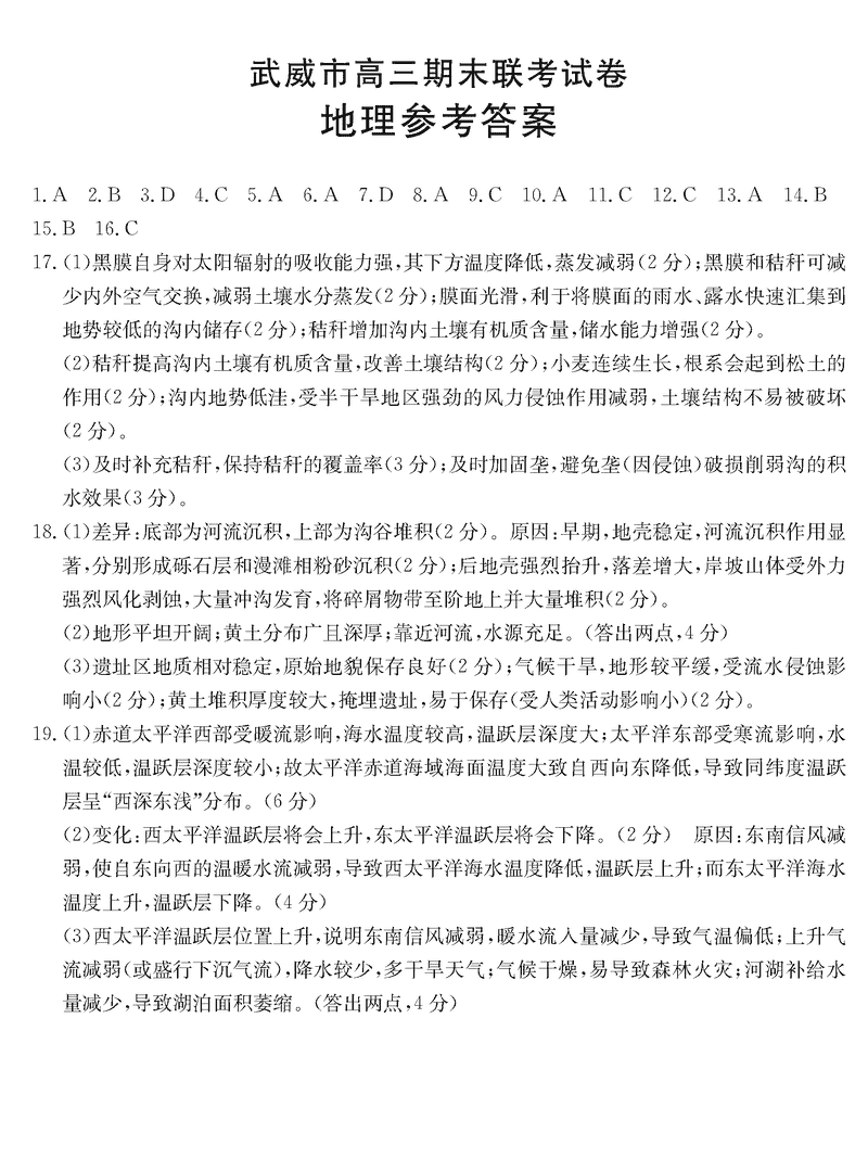 甘肃武威2025届高三上学期1月期末联考地理考试已于近日开考,为方便考生考后及时查看考试情况,查漏补缺、弥补不足,本文整理了试题答案解析相关信息!
