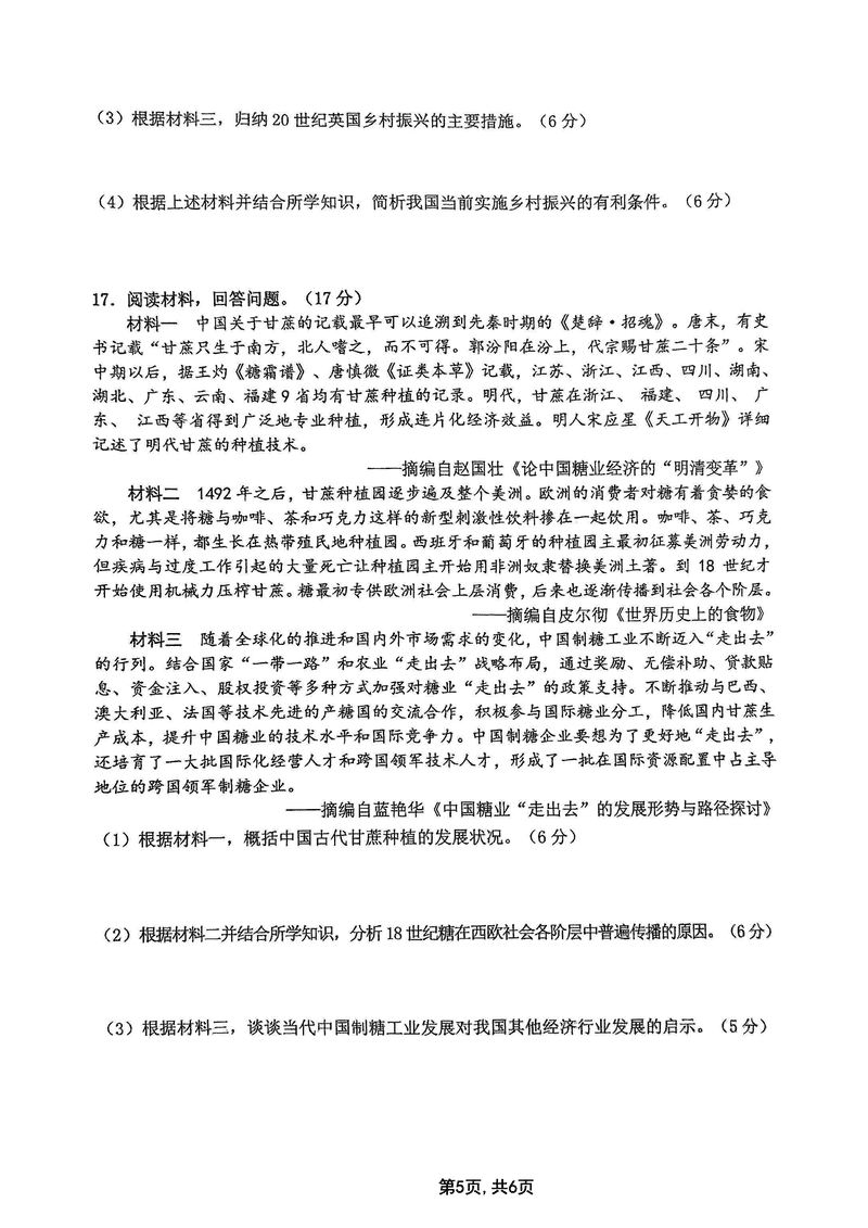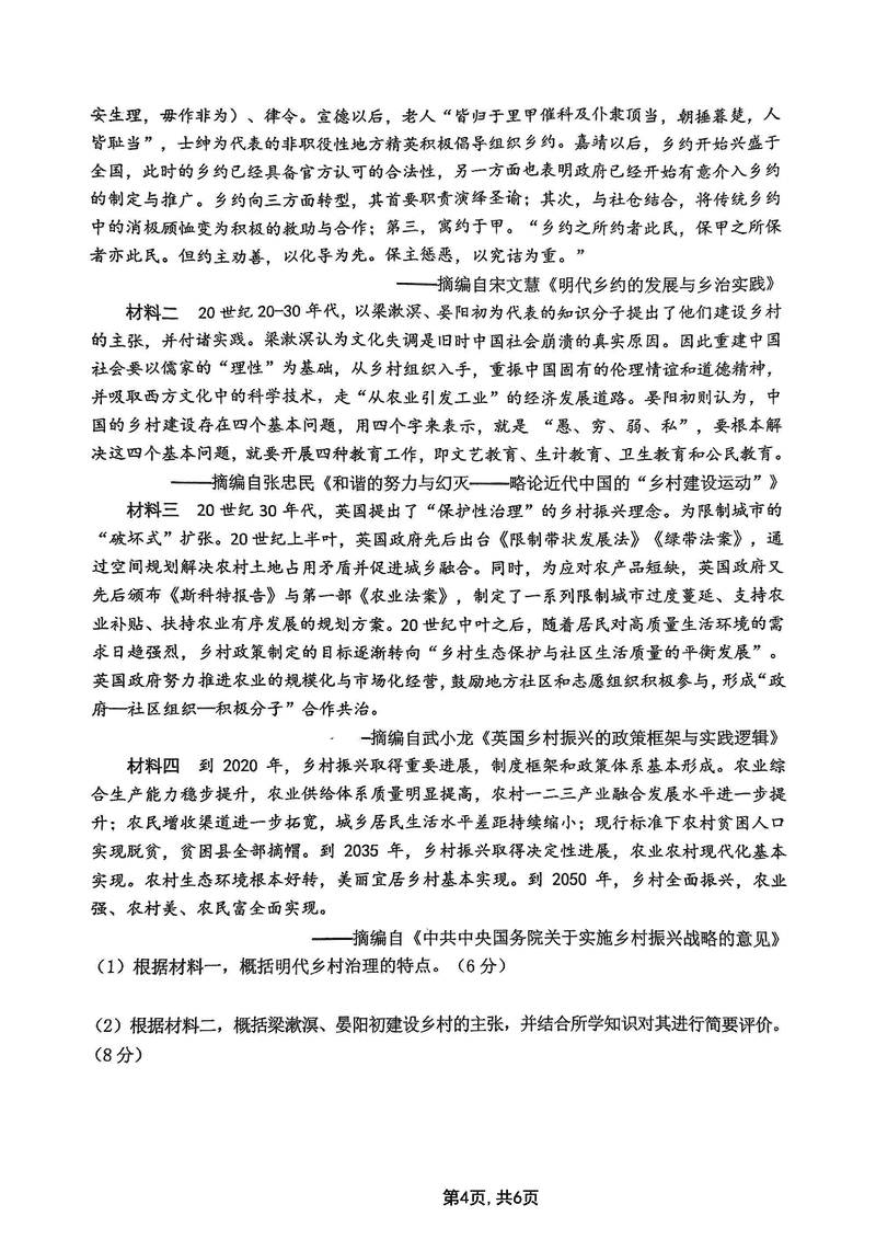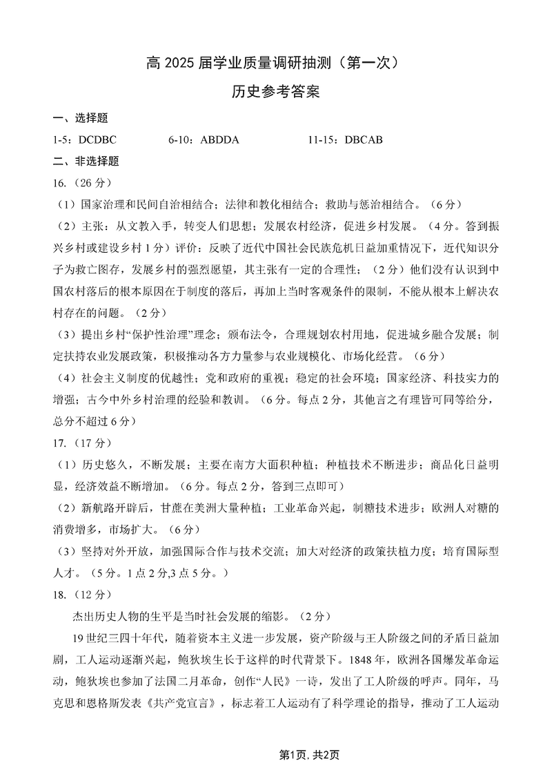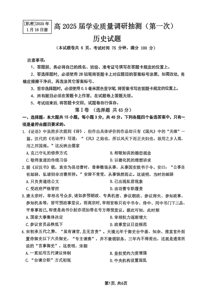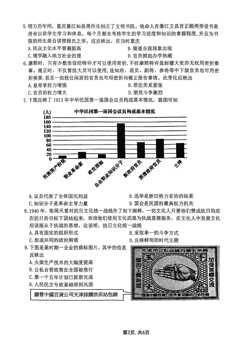 重庆主城五区一诊暨九龙坡高2025届学业质量调研历史试题及答案