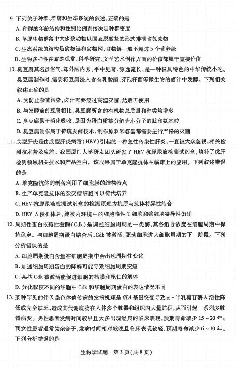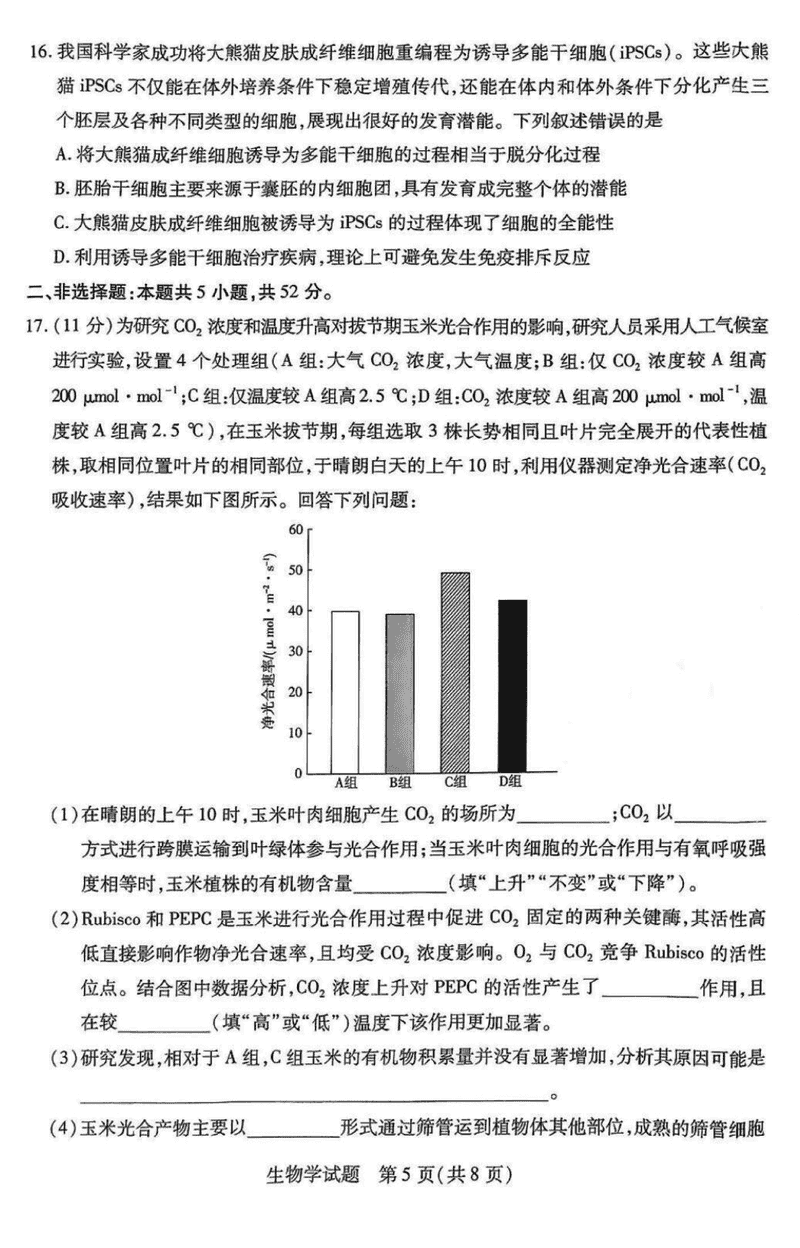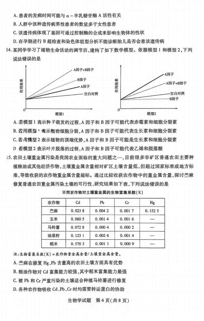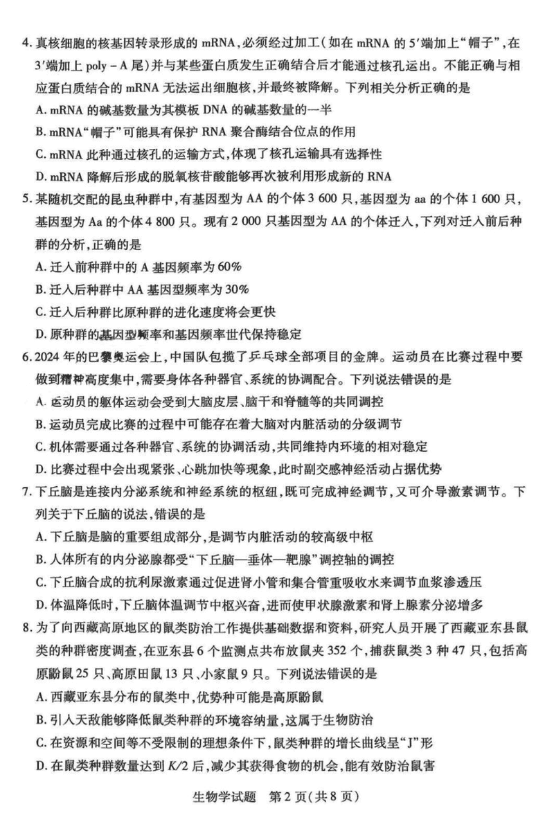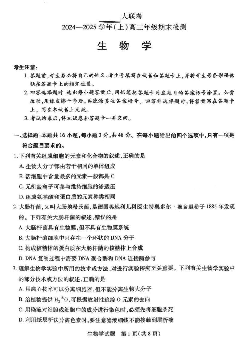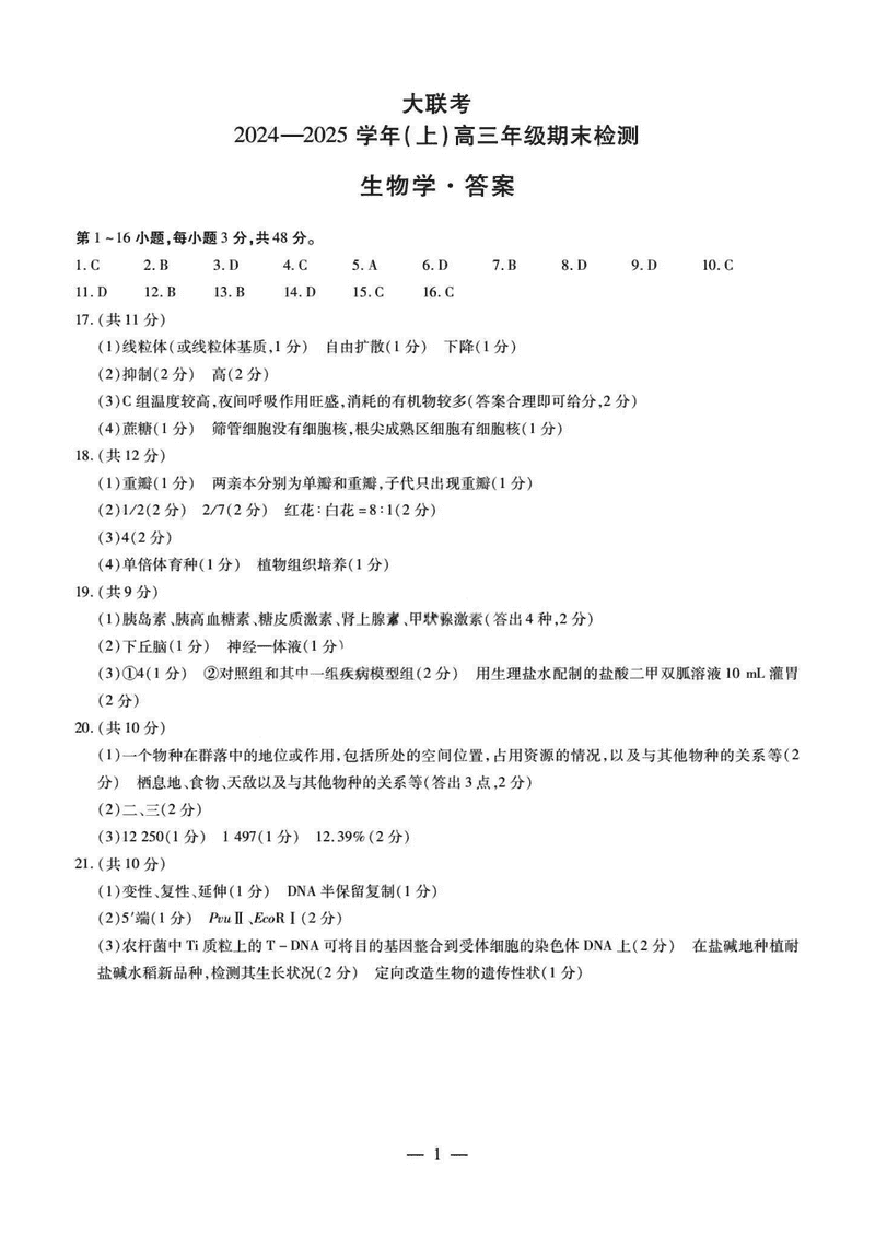皖豫天一大联考2025届高三1月期末检测生物试题及答案