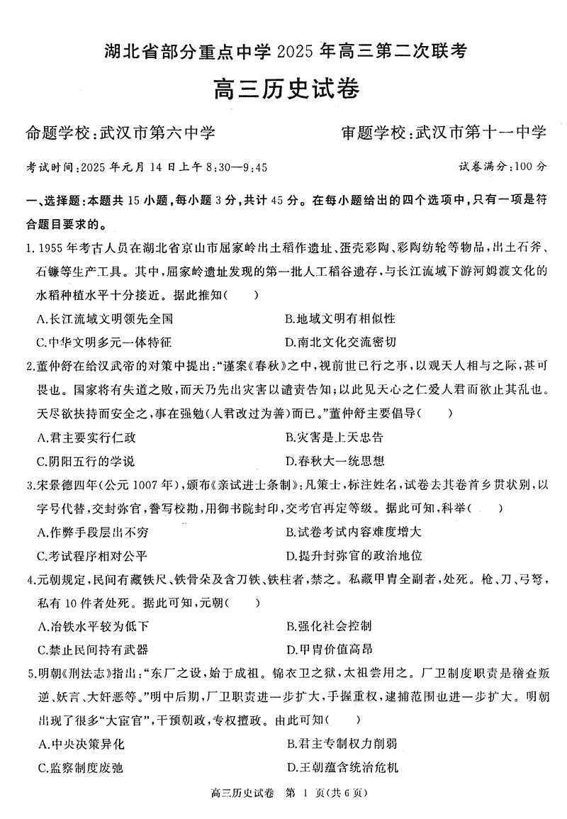 湖北部分重点中学2025届高三第二次联考历史试题及答案