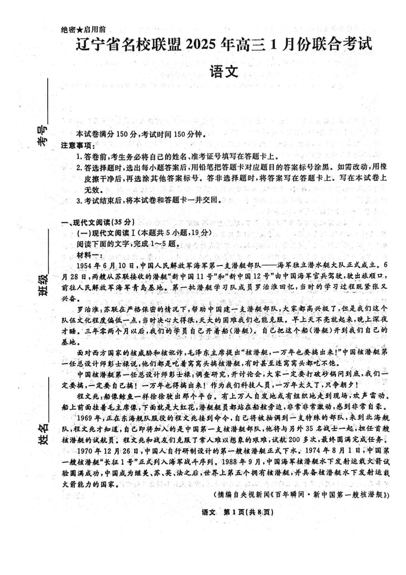 辽宁名校联盟2025年高三上学期1月联考语文考试已于近日开考,为方便考生考后及时查看考试情况,查漏补缺、弥补不足,本文整理了试题答案解析相关信息!