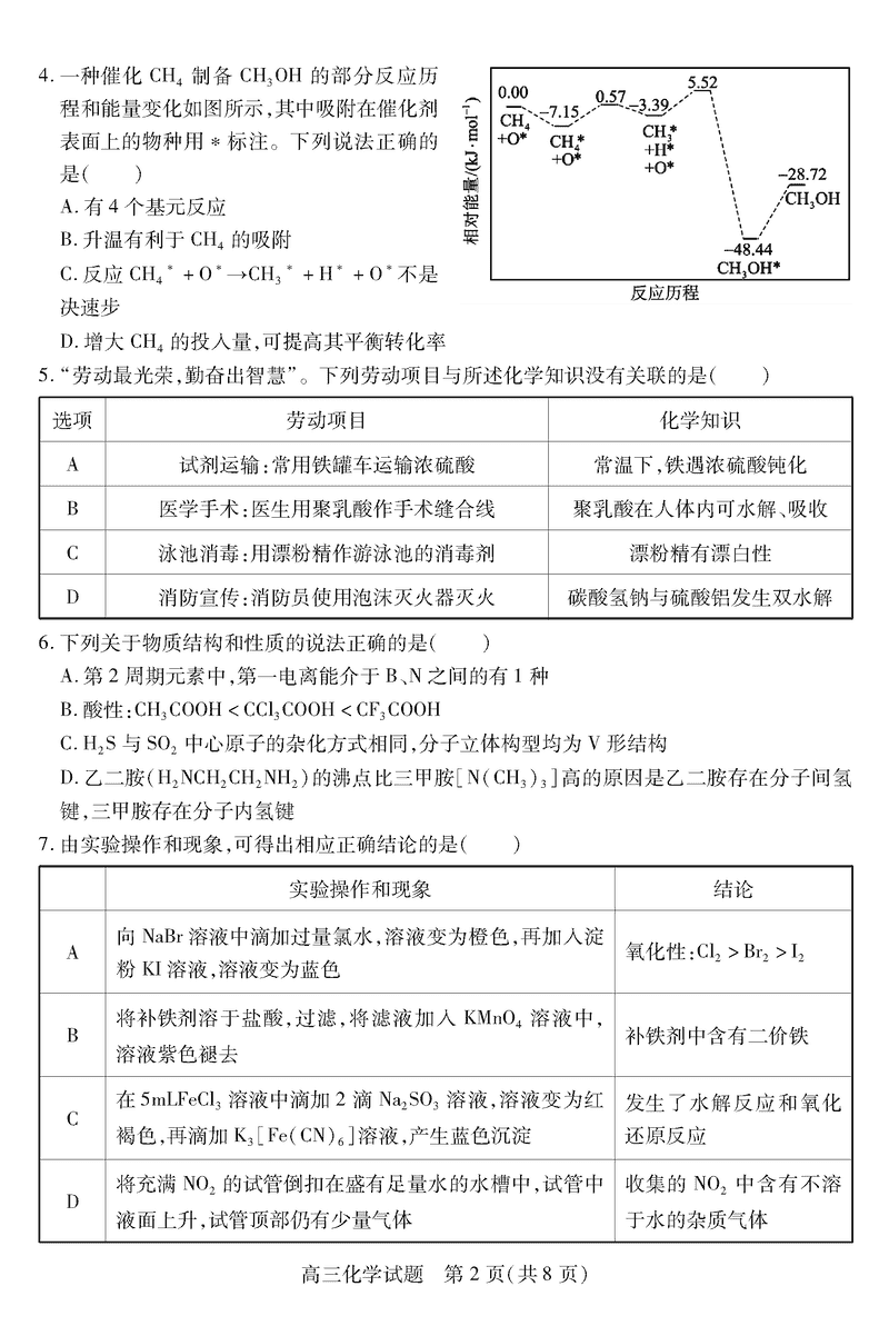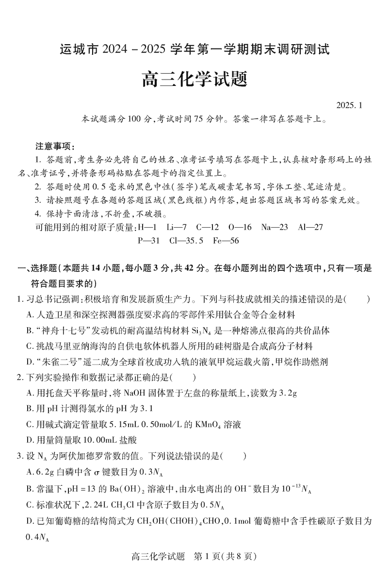 运城市2025年1月高三上学期期末调研化学试题及答案