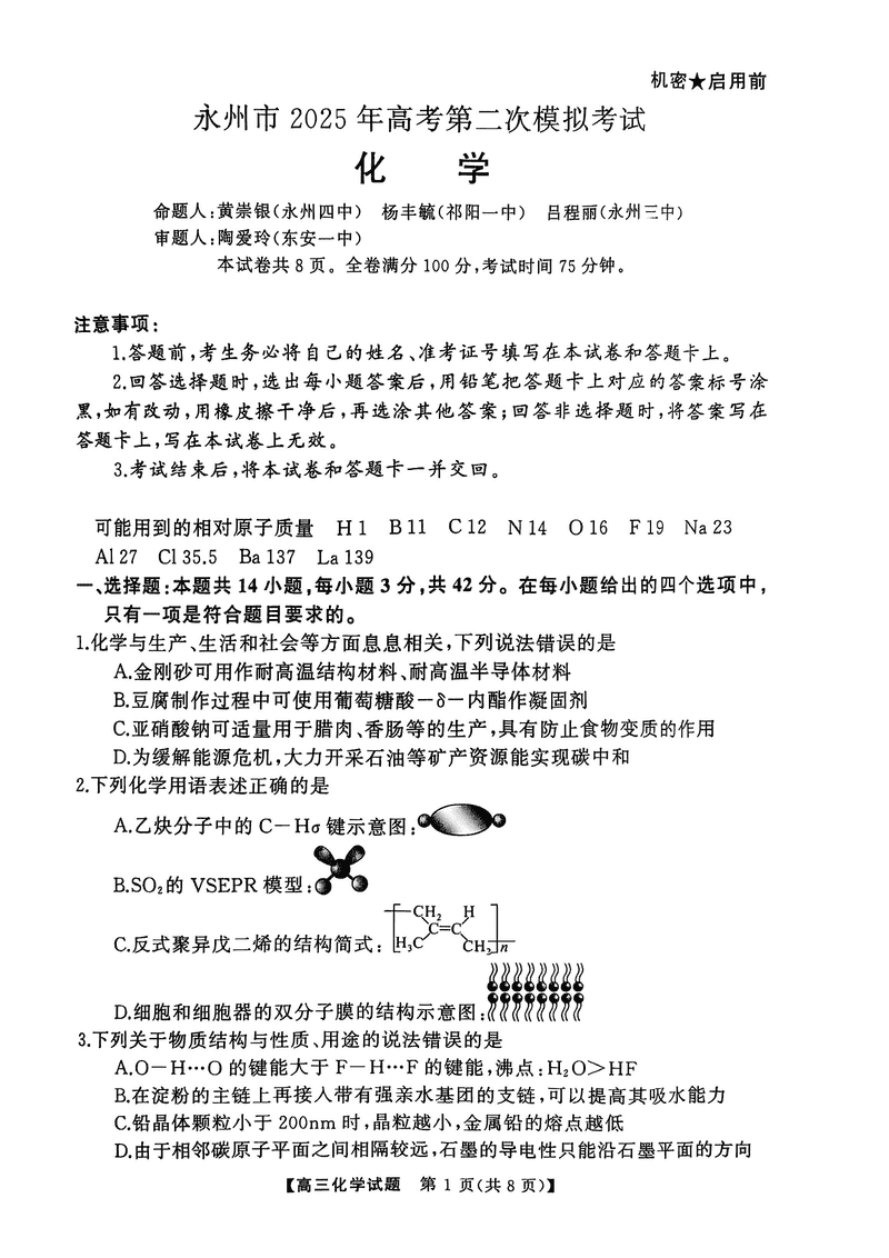湖南永州2025年高考第二次模考化学考试已于近日开考,为方便考生考后及时查看考试情况,查漏补缺、弥补不足,本文整理了试题答案解析相关信息!