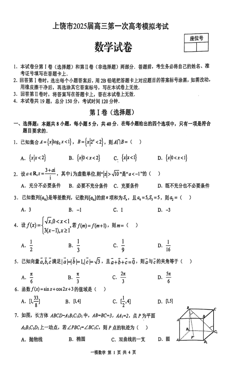 江西上饶2025届高三第一次高考模考数学考试已于近日开考,为方便考生考后及时查看考试情况,查漏补缺、弥补不足,本文整理了试题答案解析相关信息!