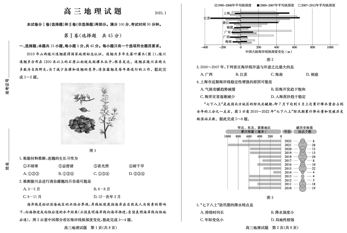 山东德州2025年高三上学期1月期末地理试题及答案