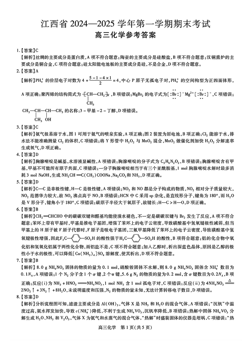 江西智慧上进教育稳派联考2025届高三上1月期末化学试题及答案