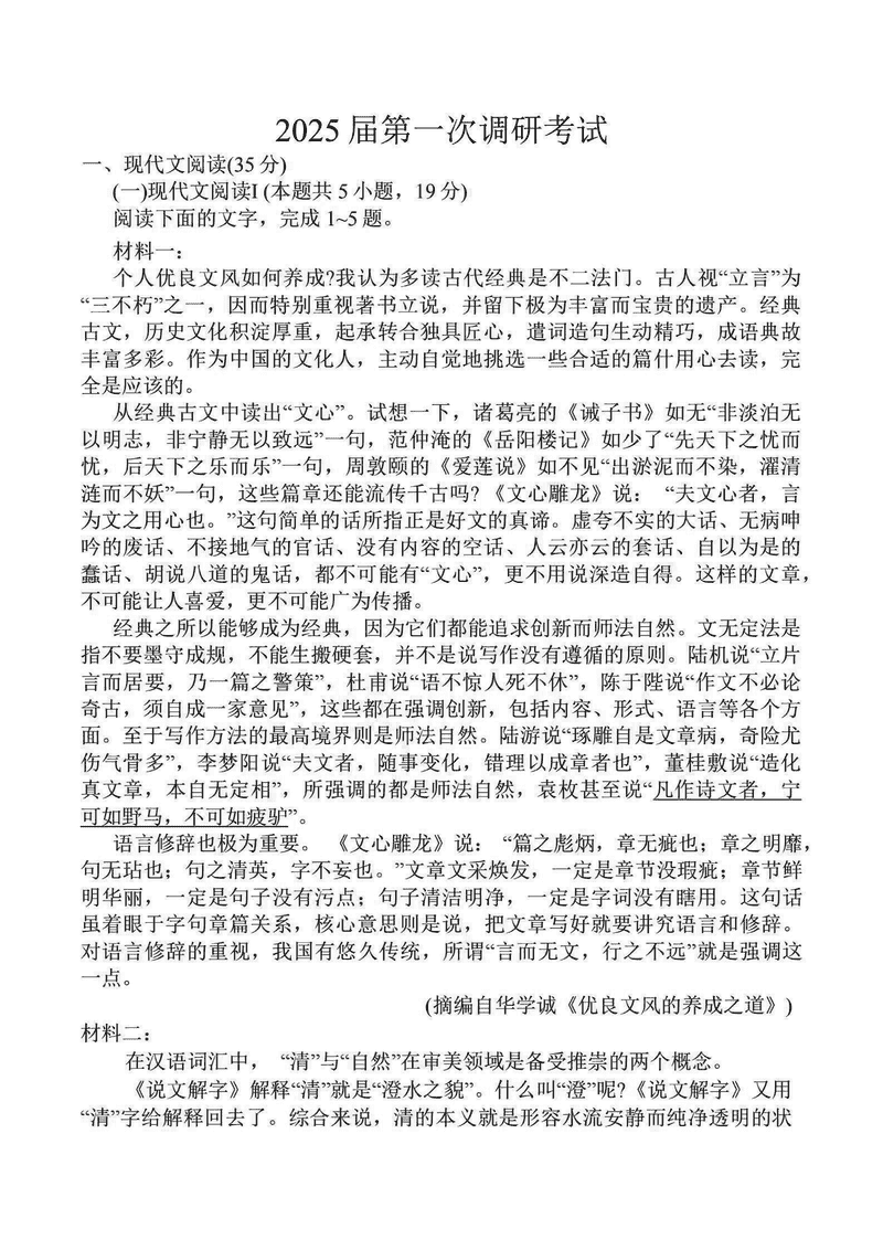 苏北四市2025届高三第一次调研语文试题及答案 时间:2025-01-20 江苏 语文试题 苏北四市(徐州、宿迁、淮安、连云港)2025届高三第一次调研语文考试已于近日开考,为方便考生考后及时查看考试情况,查漏补缺、弥补不足,本文整理了试题答案解析相关信息! 汇总:苏北四市2025届高三第一次调研测试试题及答案汇总 语文试题及答案解析