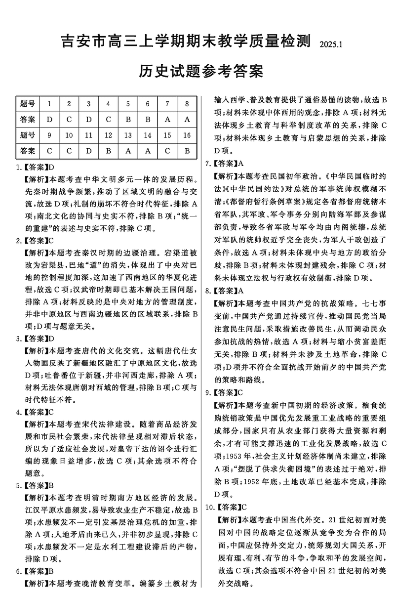 江西吉安2025届高三上1月期末教学质检历史考试已于近日开考,为方便考生考后及时查看考试情况,查漏补缺、弥补不足,本文整理了试题答案解析相关信息!