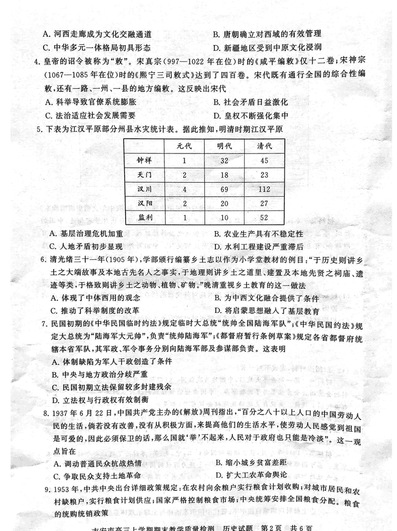 江西吉安2025届高三上1月期末教学质检历史试题及答案
