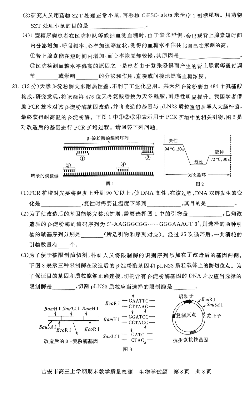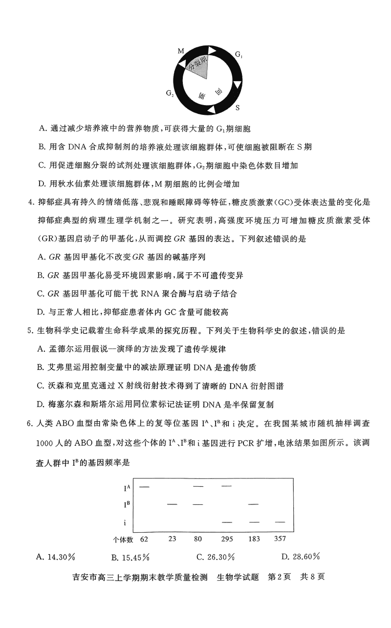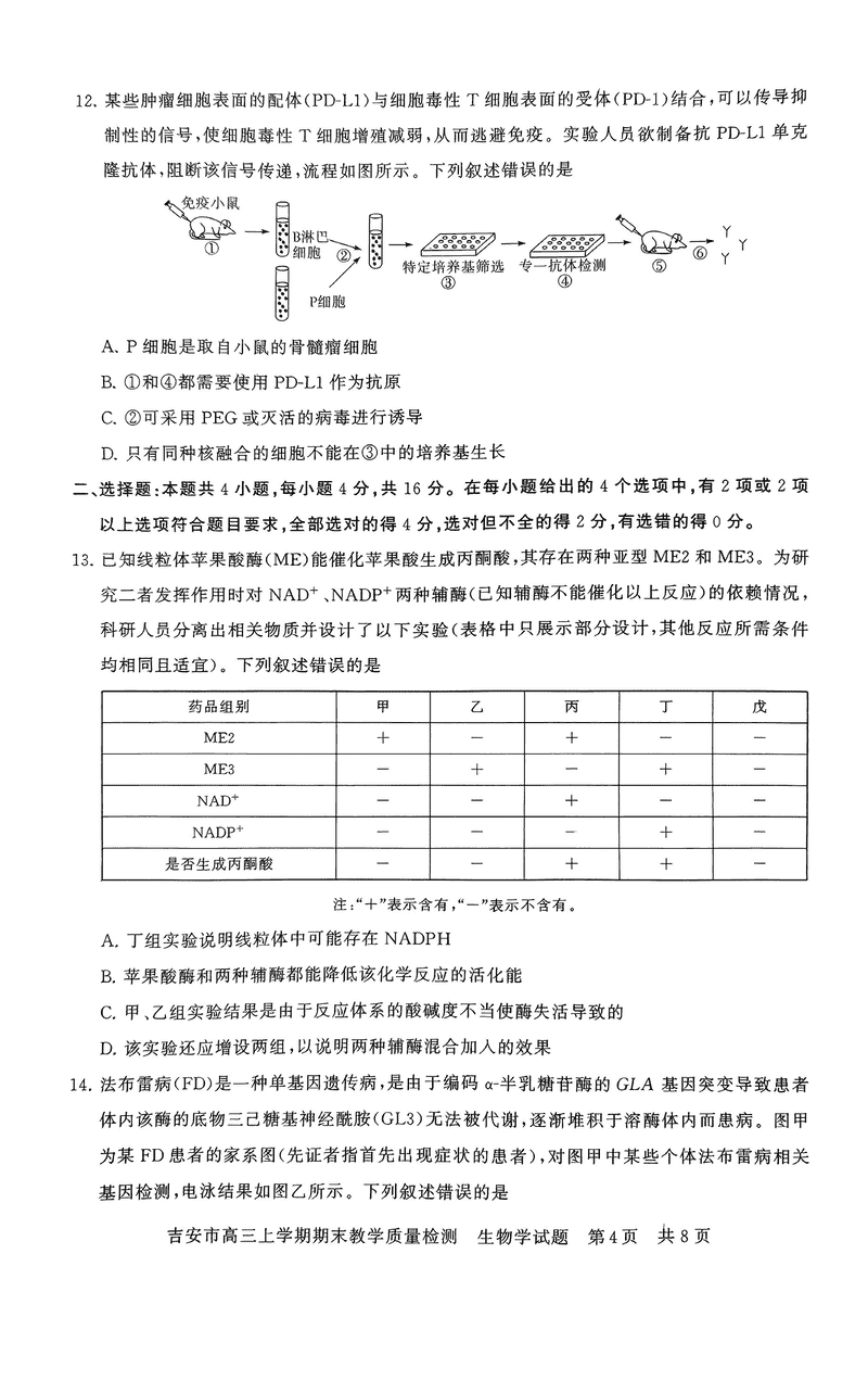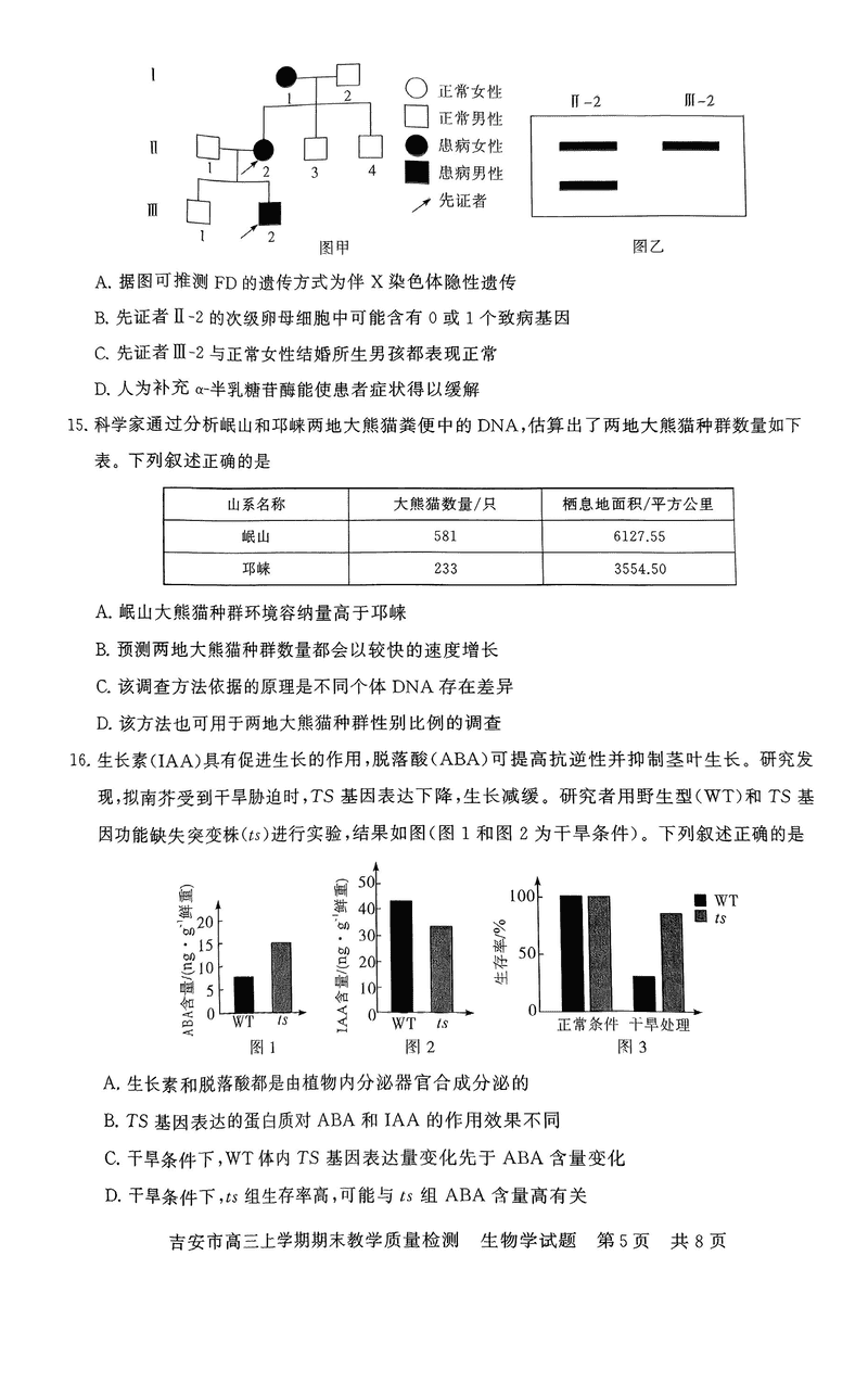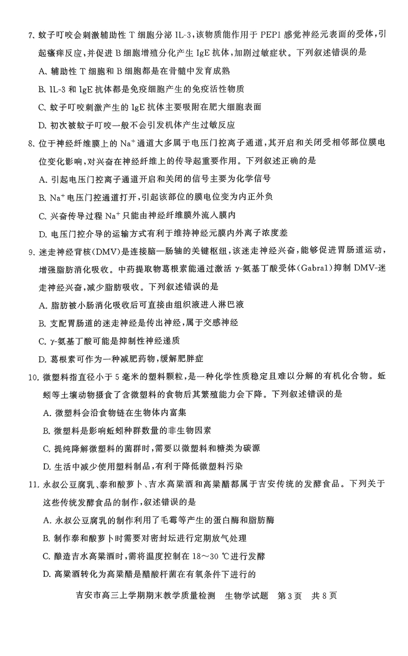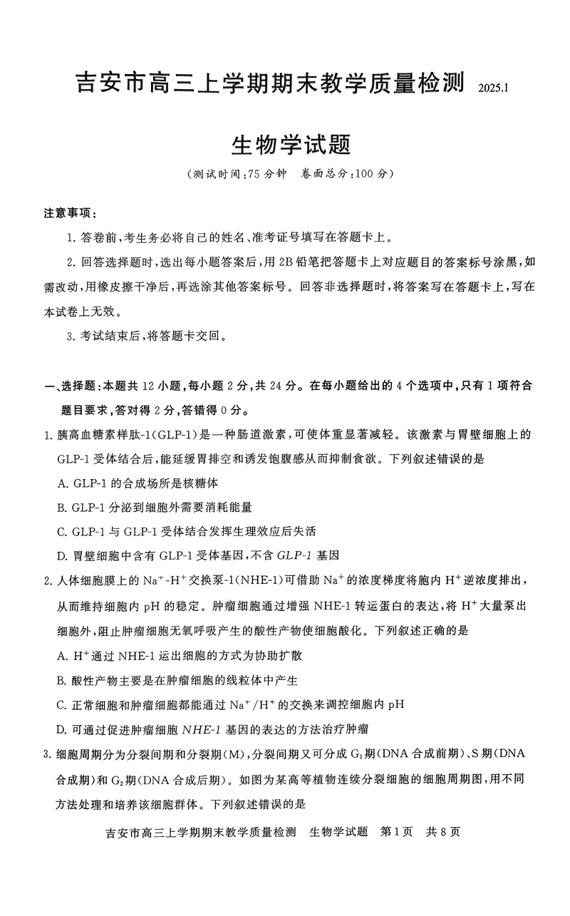 江西吉安2025届高三上1月期末教学质检生物试题及答案