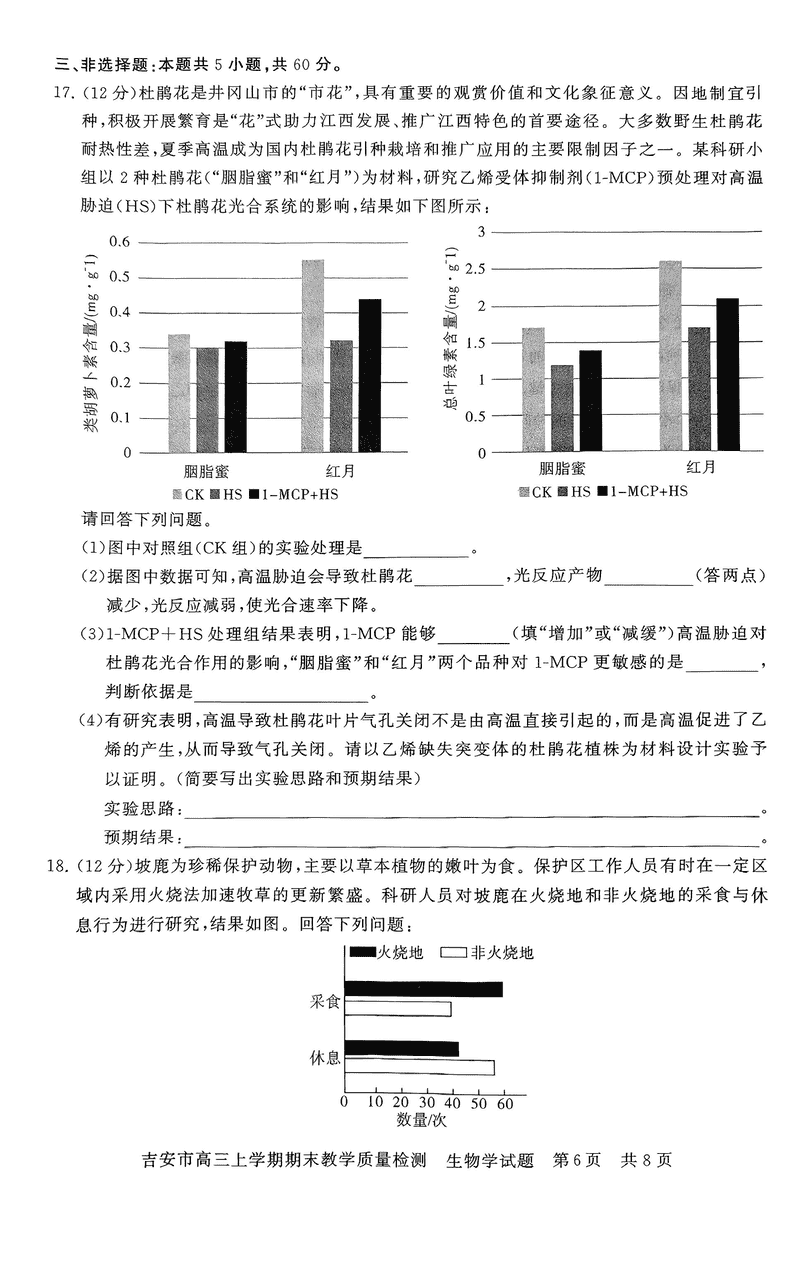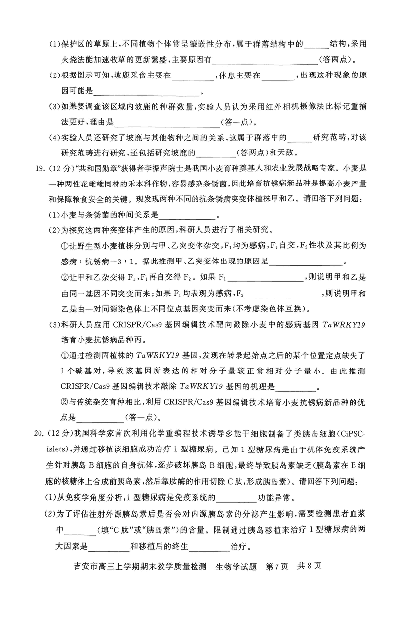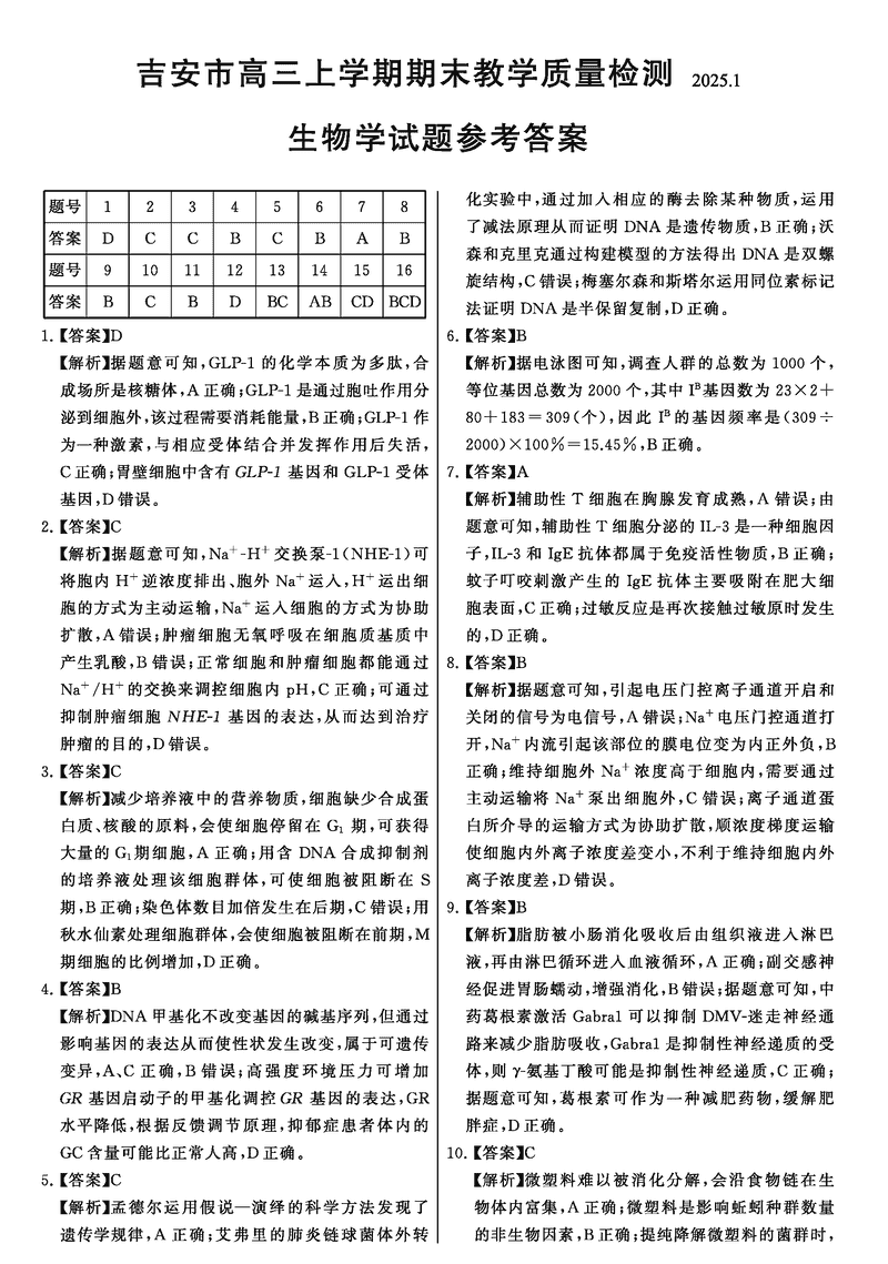 江西吉安2025届高三上1月期末教学质检生物考试已于近日开考,为方便考生考后及时查看考试情况,查漏补缺、弥补不足,本文整理了试题答案解析相关信息!