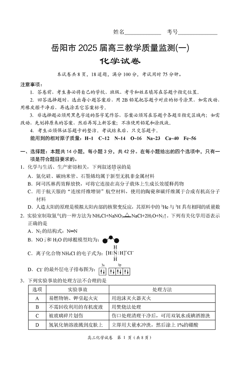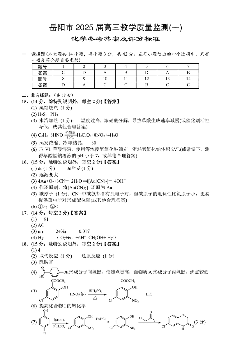 湖南岳阳2025届高三上学期教学质量监测一化学考试已于近日开考,为方便考生考后及时查看考试情况,查漏补缺、弥补不足,本文整理了试题答案解析相关信息!