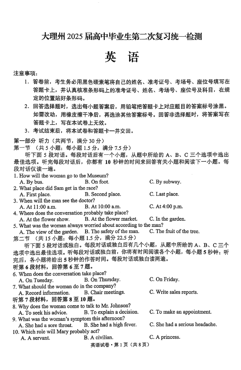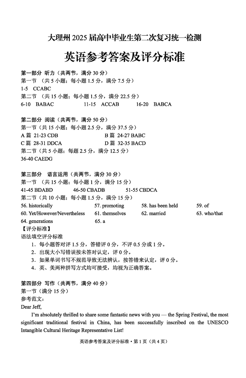 云南大理2025届高三第二次复习统测英语考试已于近日开考,为方便考生考后及时查看考试情况,查漏补缺、弥补不足,本文整理了试题答案解析相关信息!