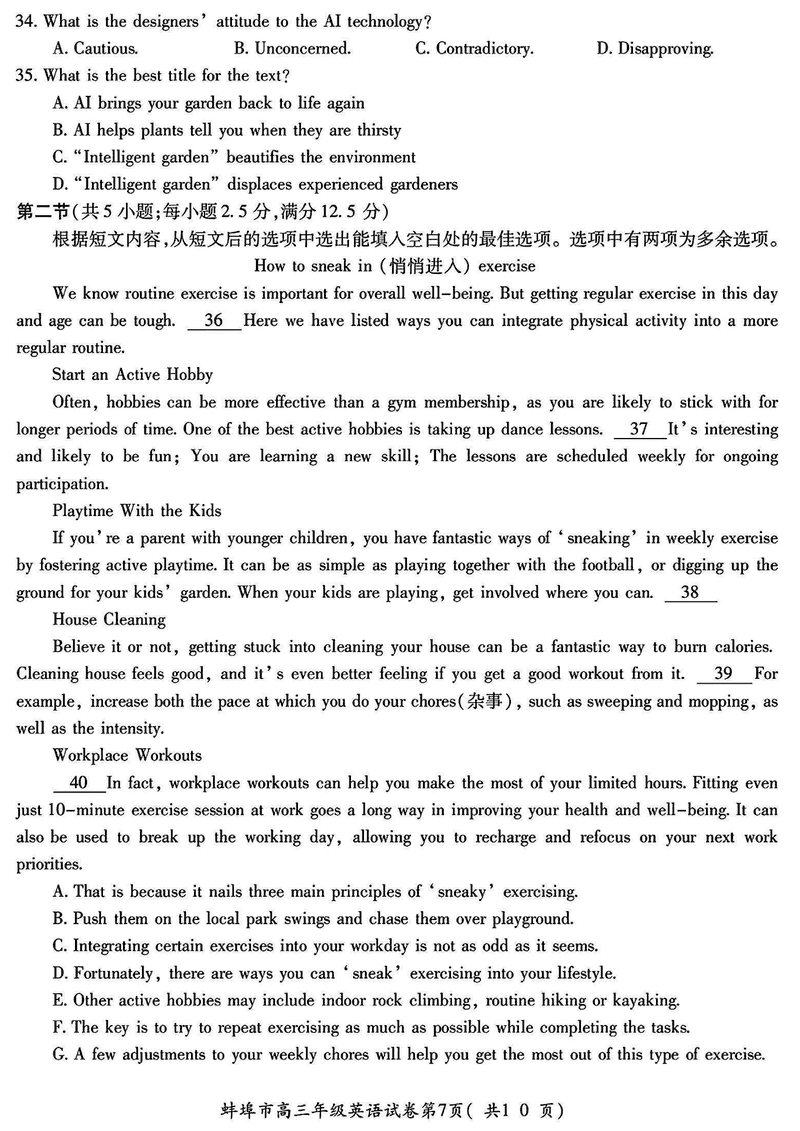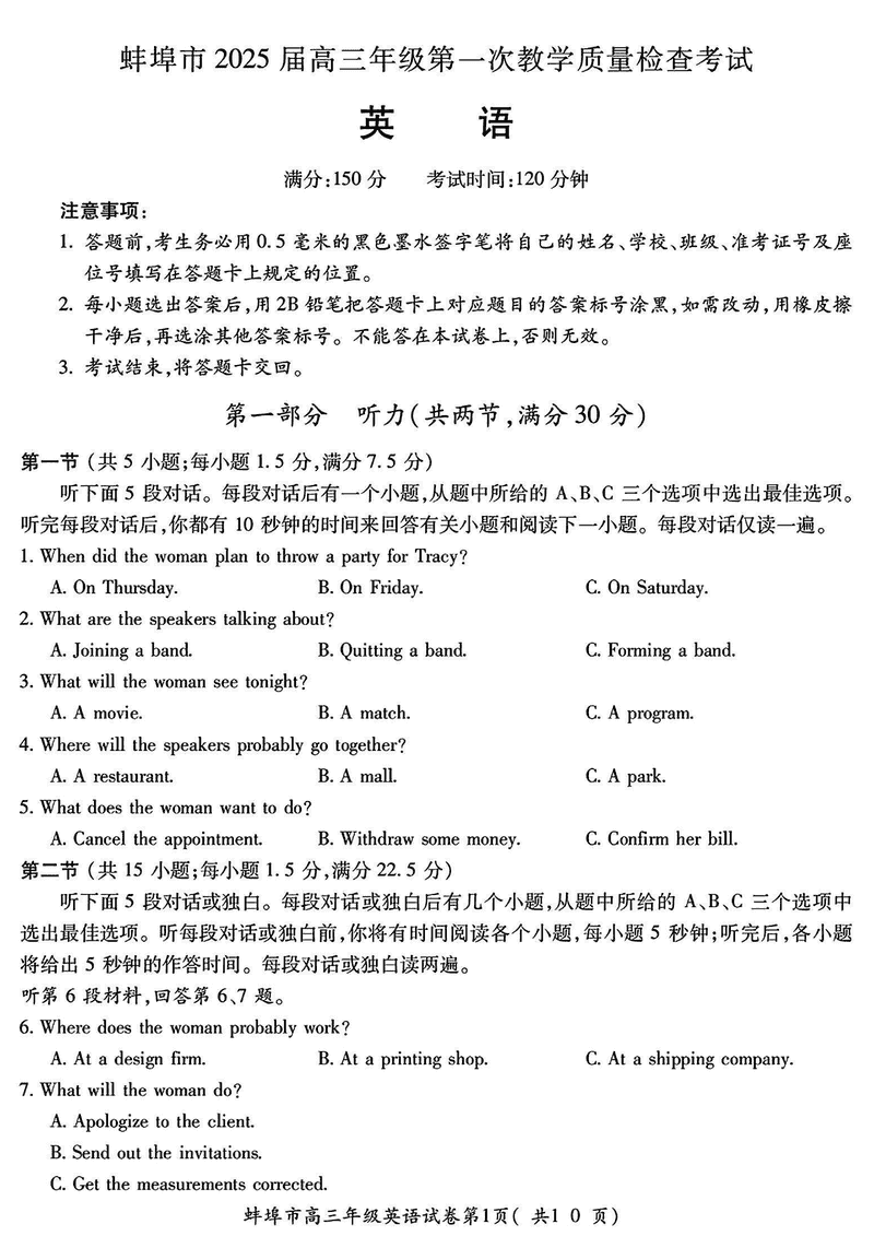 安徽蚌埠2025届高三上学期1月第一次教学质量检查英语试题及答案
