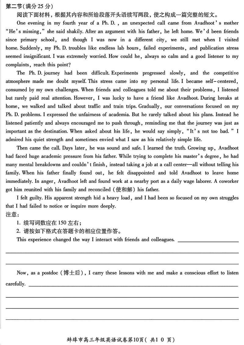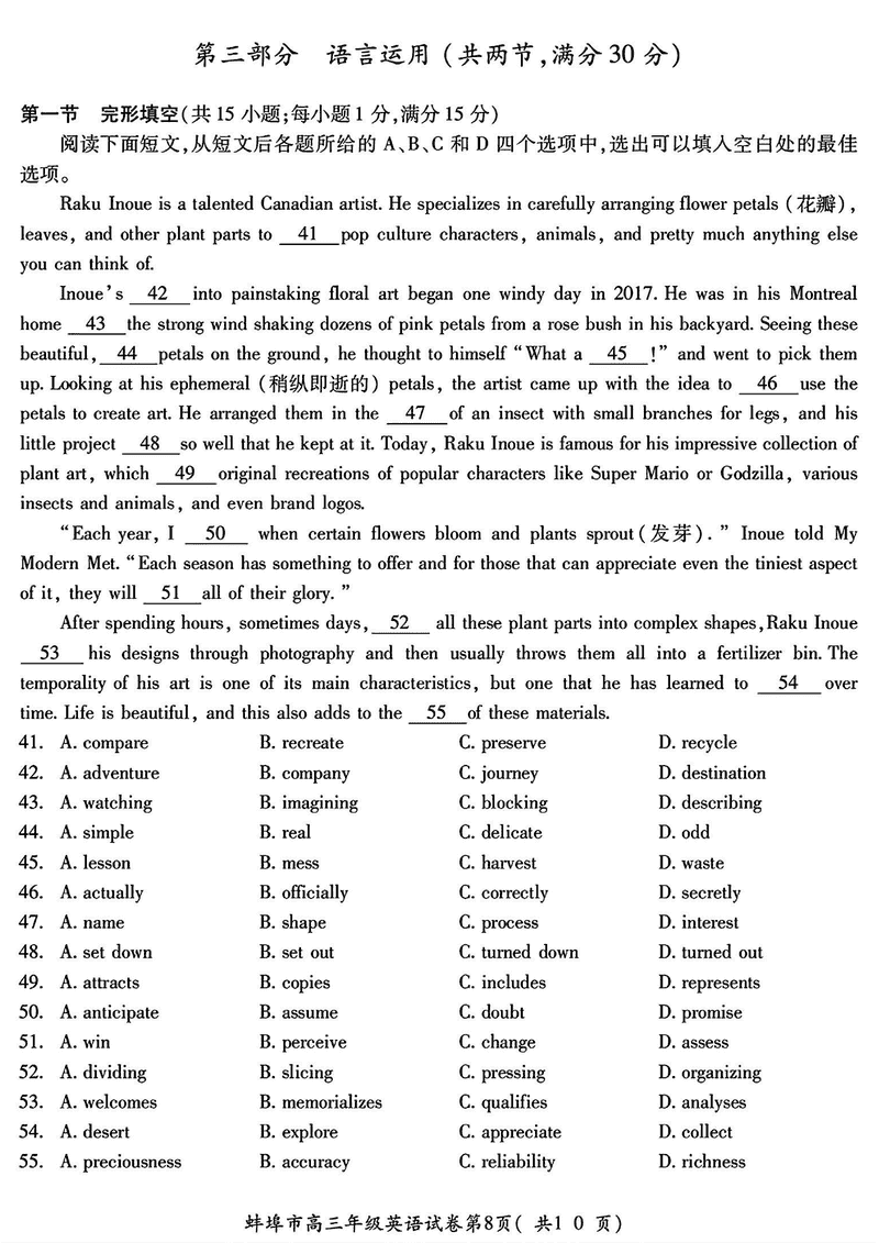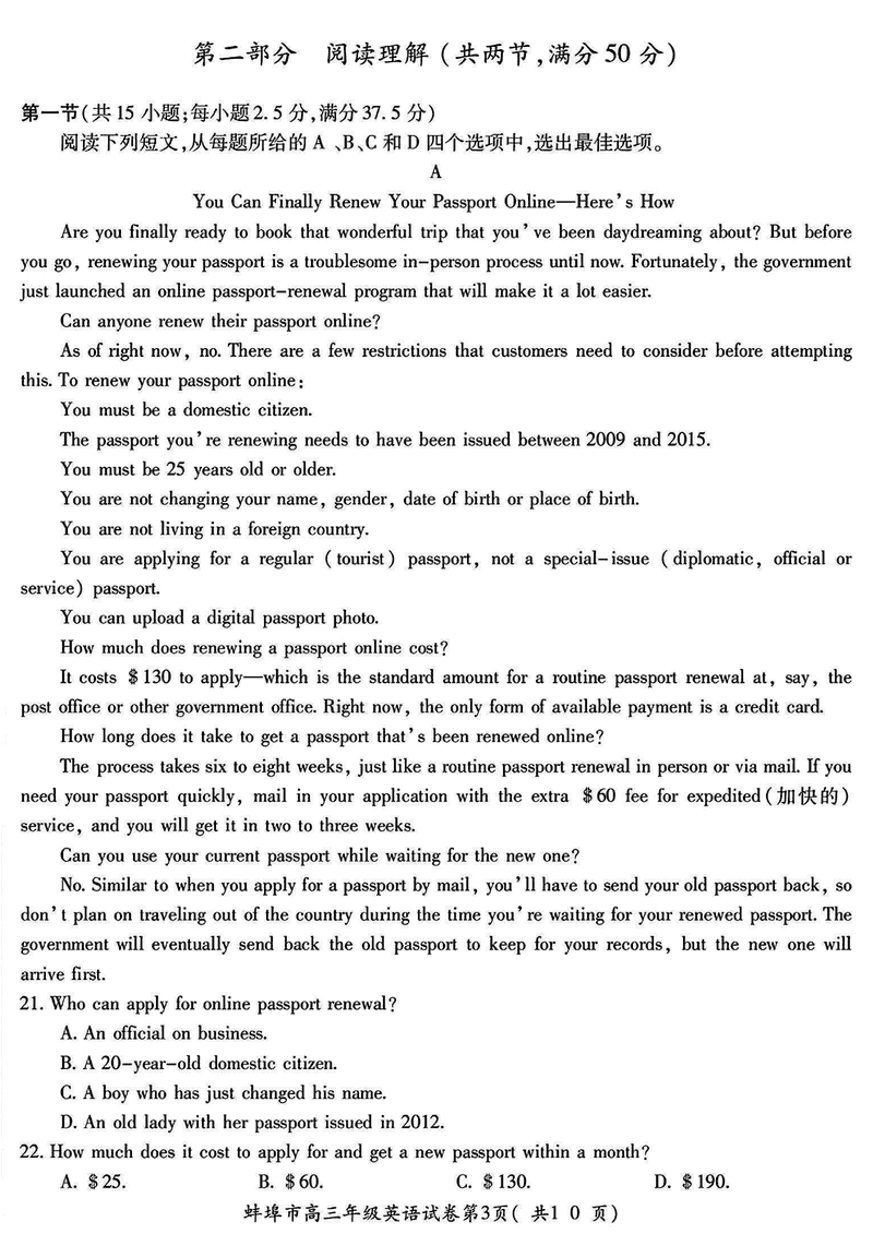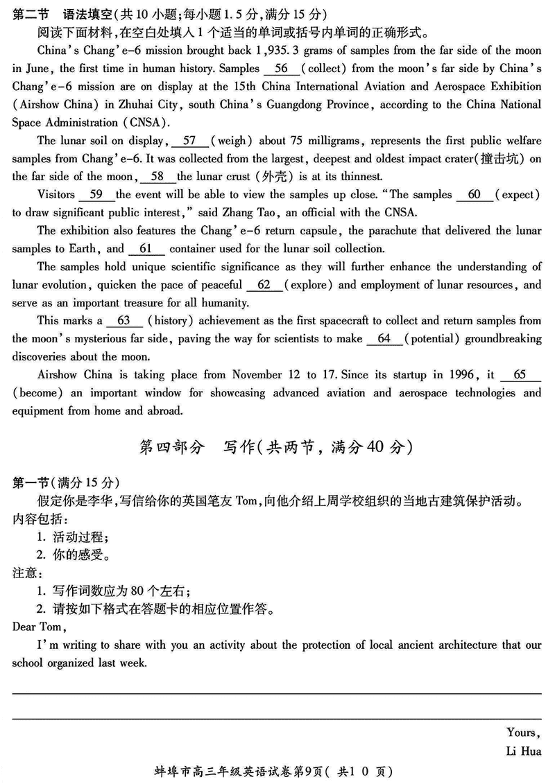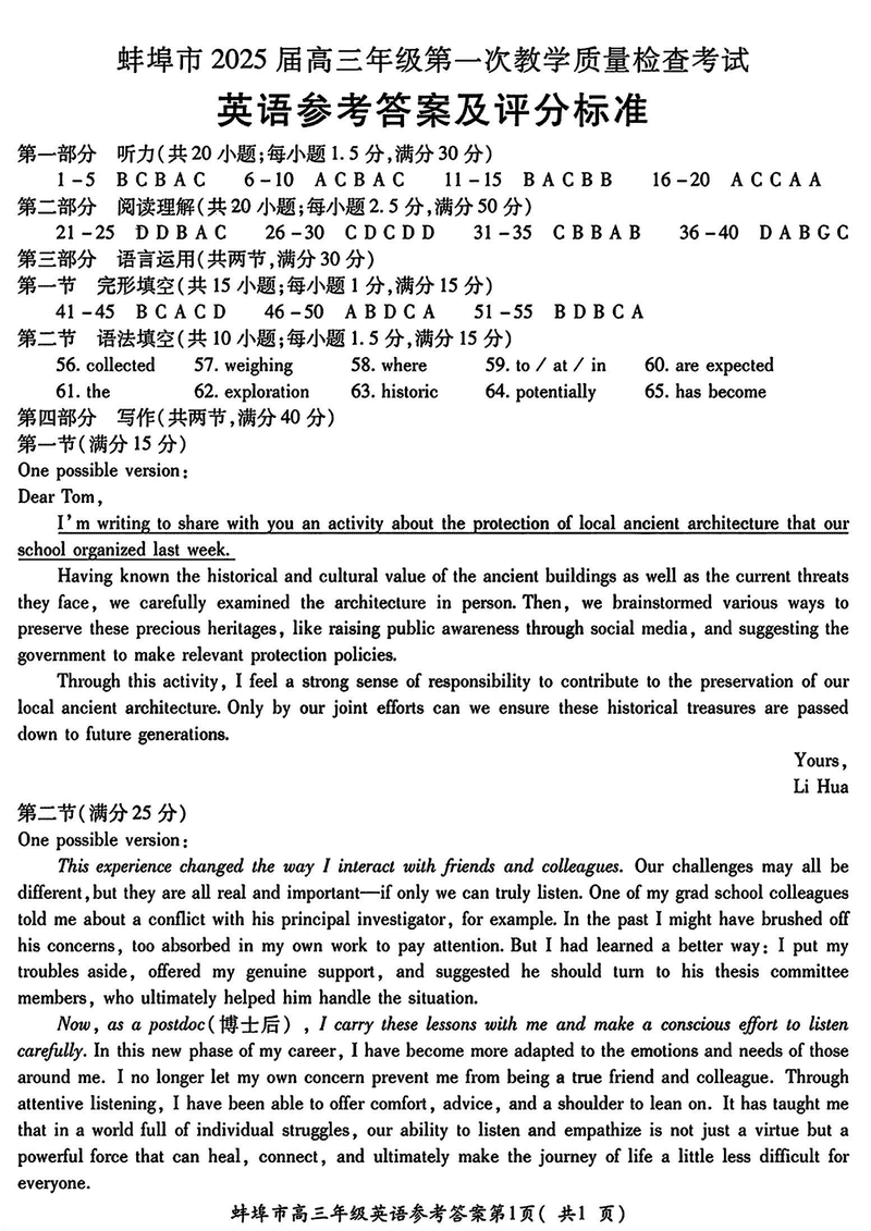 安徽蚌埠2025届高三上学期1月第一次教学质量检查英语考试已于近日开考,为方便考生考后及时查看考试情况,查漏补缺、弥补不足,本文整理了试题答案解析相关信息!