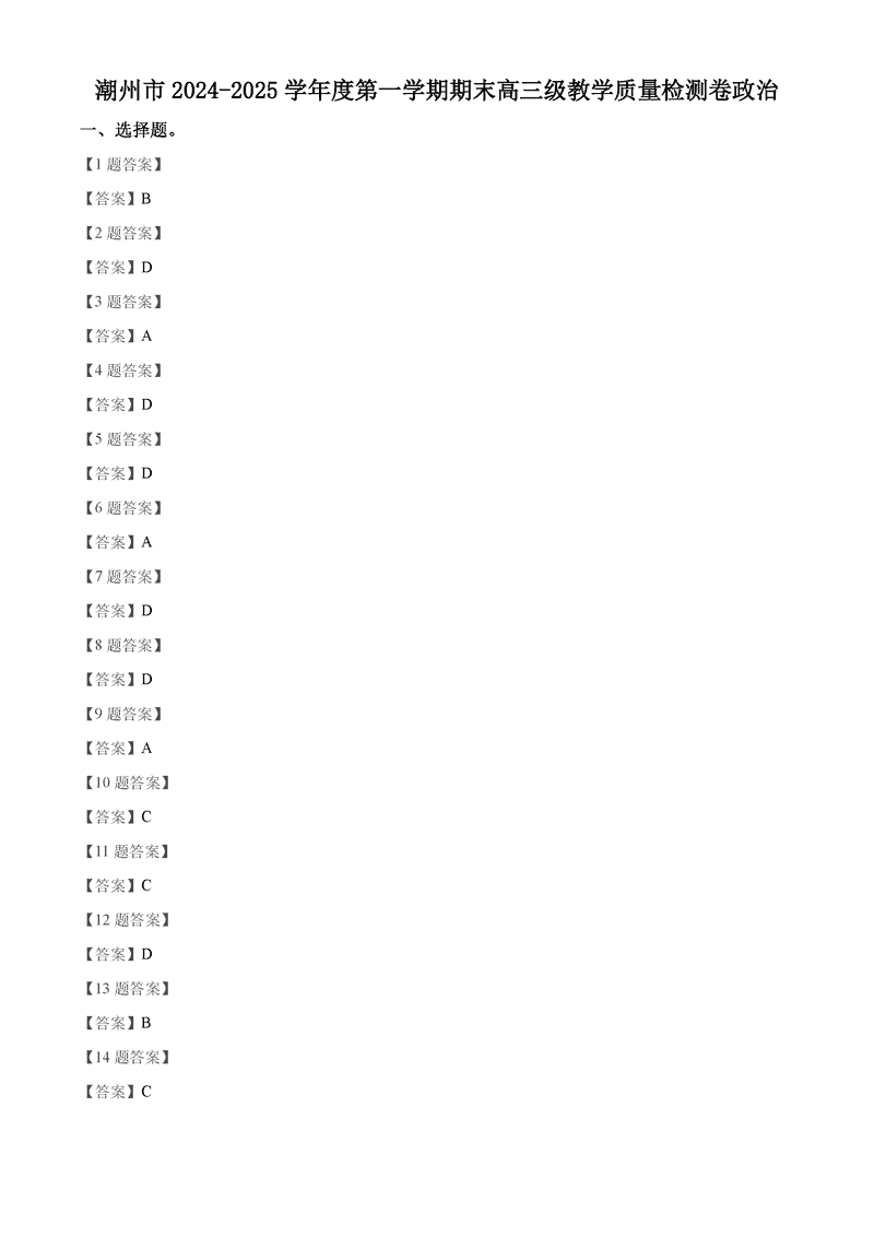 广东潮州2025年高三期末教学质检政治试题及答案 时间:2025-01-24 广东 文综试题 广东潮州2025年高三期末教学质检政治考试已于近日开考,为方便考生考后及时查看考试情况,查漏补缺、弥补不足,本文整理了试题答案解析相关信息! 汇总:广东省潮州市2025年高三期末教学质检试题及答案汇总 政治试题及答案解析