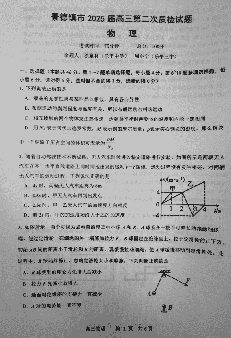江西景德镇2025届高三上学期第二次质检物理试题及答案