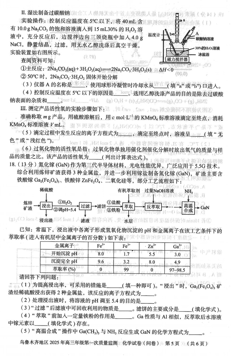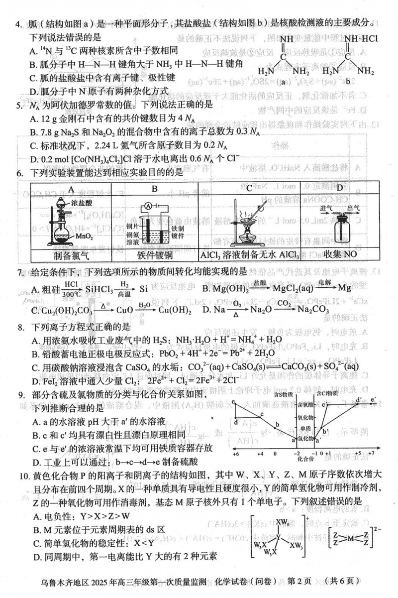 新疆乌鲁木齐2025年高三第一次质量监测化学试题及答案