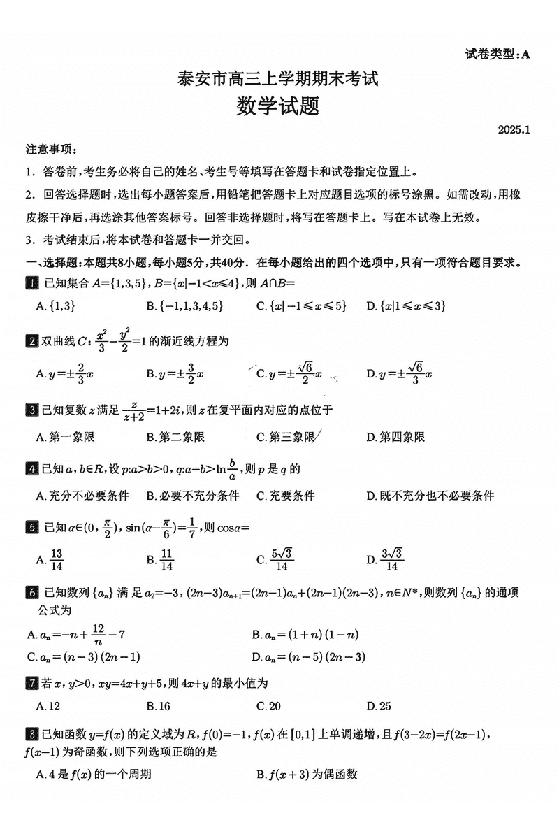 山东泰安2024-2025学年高三上学期1月期末数学试题及答案