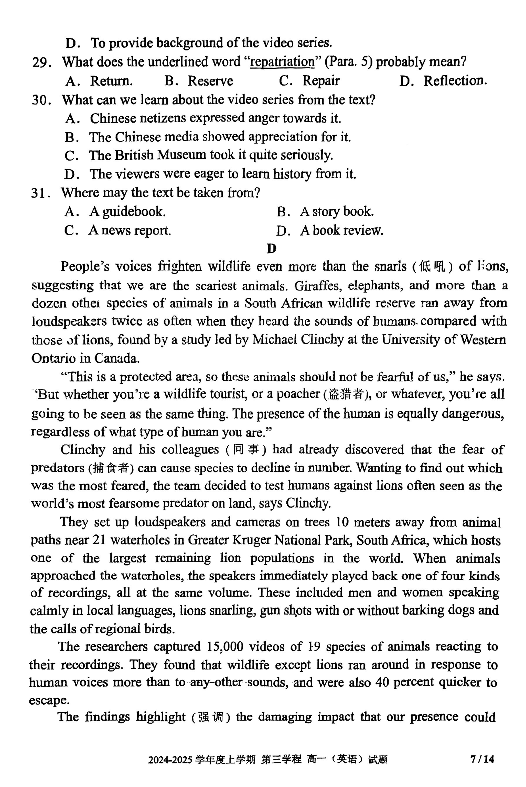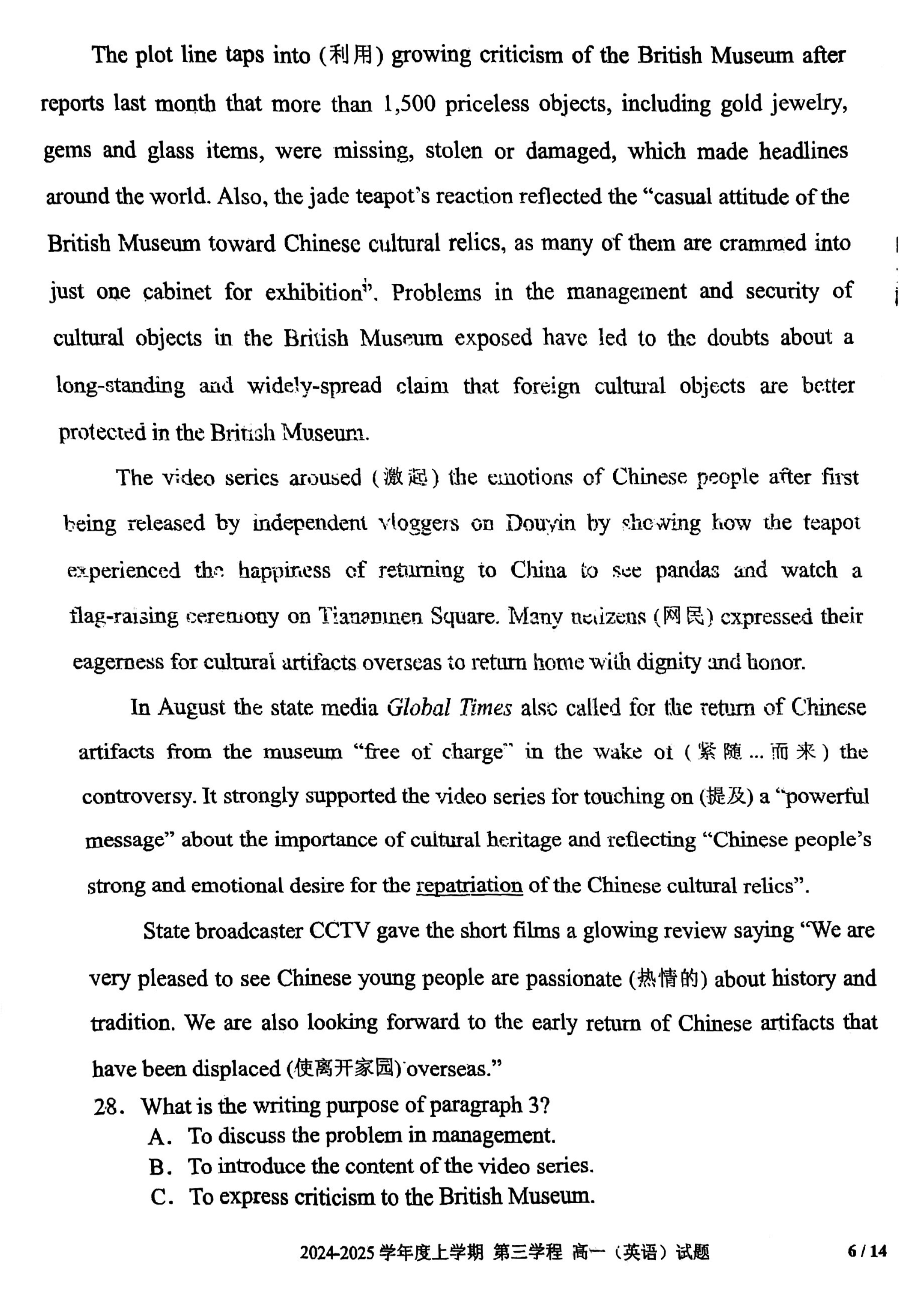 长春十一高中2024-2025学年高一上学期第三学程考英语试题及答案 时间:2025-01-27 吉林 高中英语 长春十一高中2024-2025学年高一上学期第三学程考英语考试已于近日开考,为方便考生考后及时查看考试情况,查漏补缺、弥补不足,本文整理了试题答案解析相关信息! 英语试题及答案解析