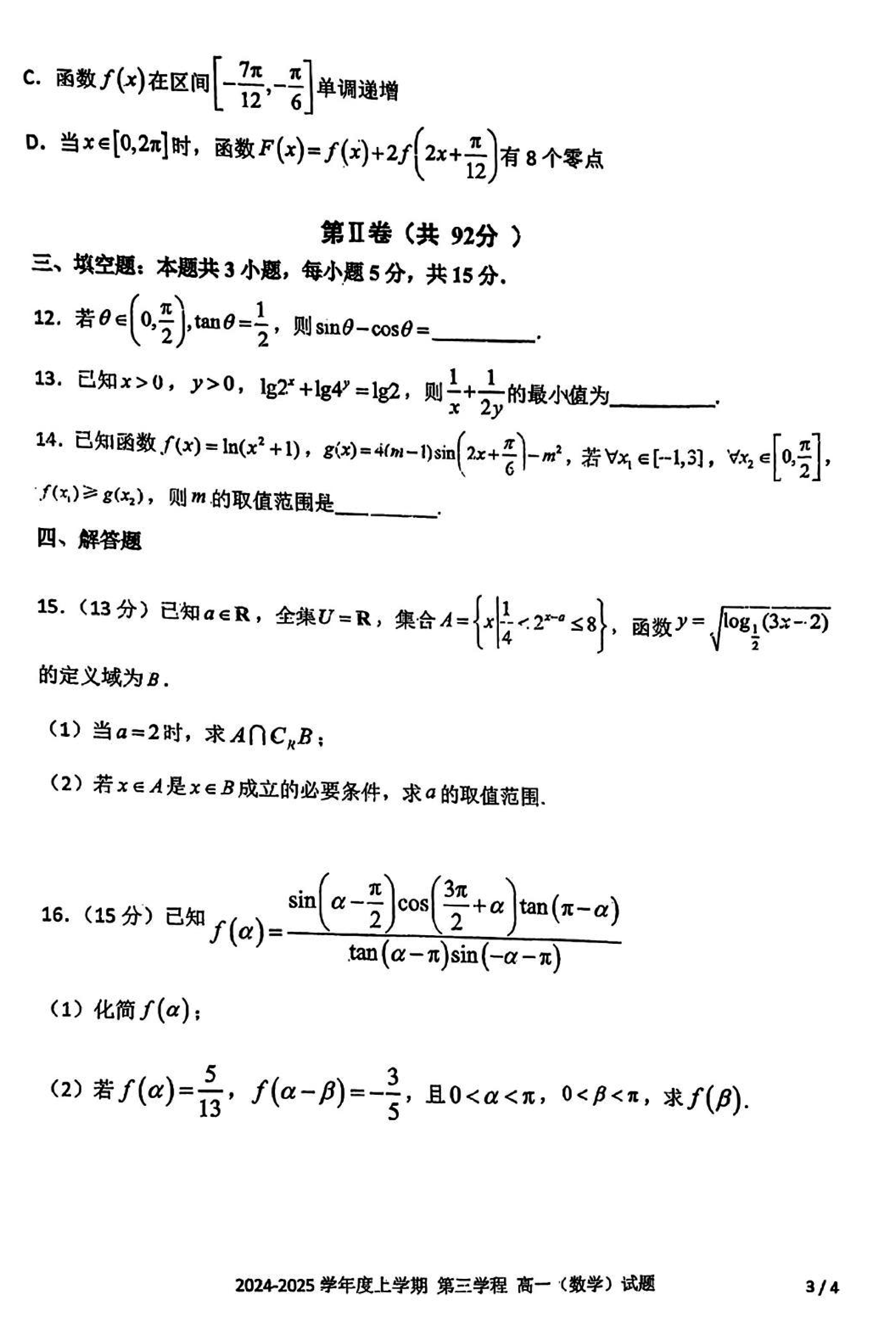 长春十一高中2024-2025学年高一上学期第三学程考数学试题及答案 时间:2025-01-27 吉林 高中数学 长春十一高中2024-2025学年高一上学期第三学程考数学考试已于近日开考,为方便考生考后及时查看考试情况,查漏补缺、弥补不足,本文整理了试题答案解析相关信息! 数学试题及答案解析