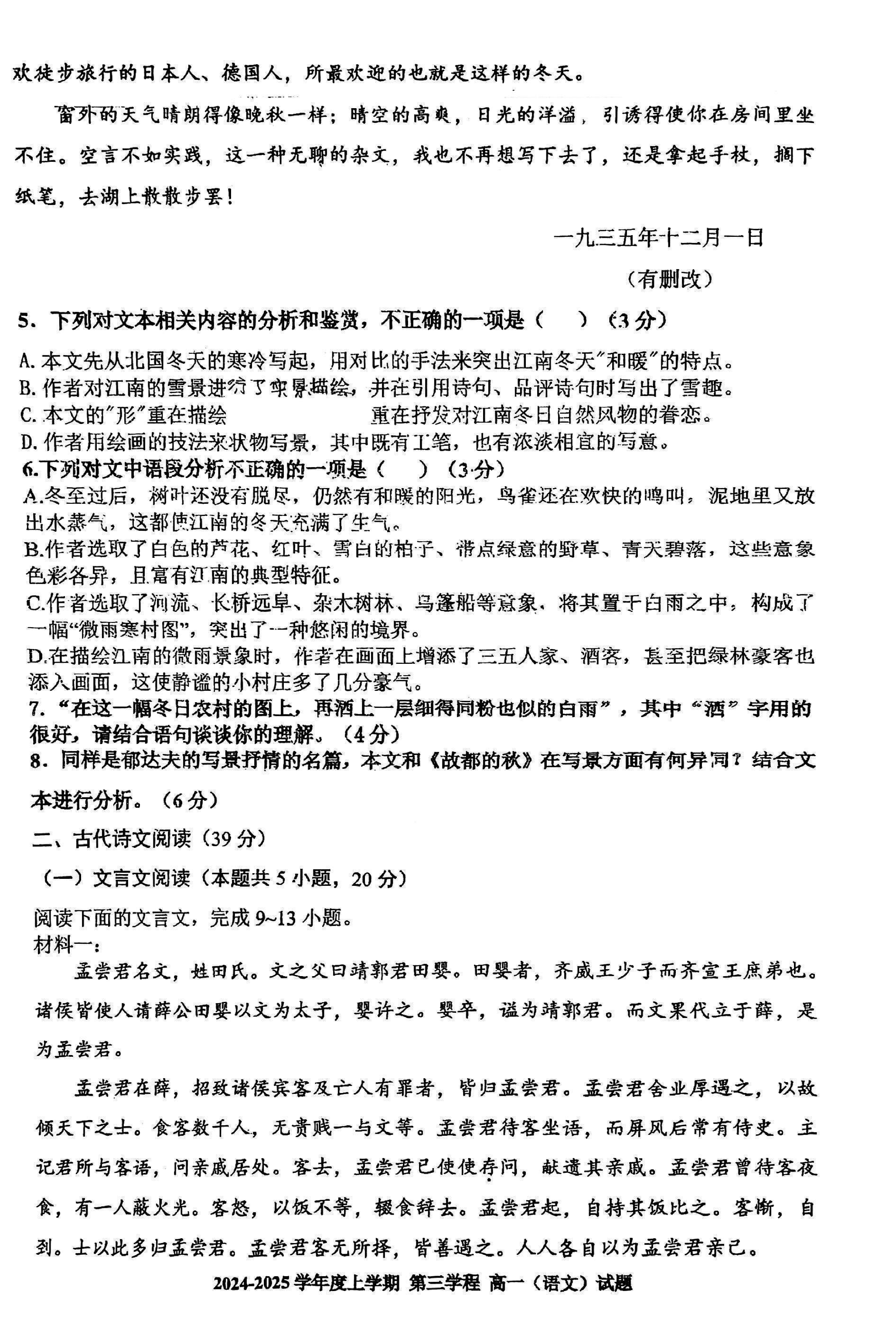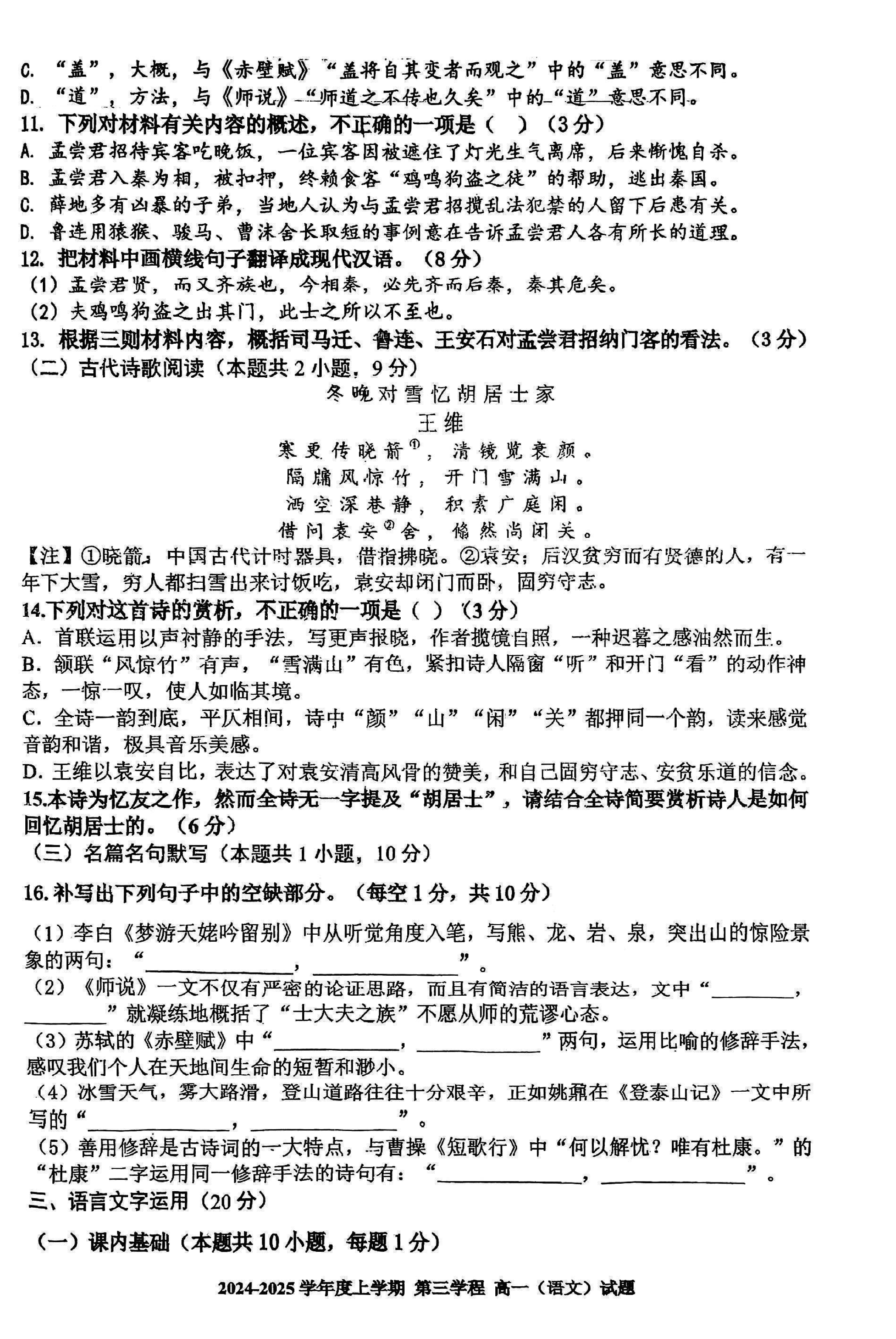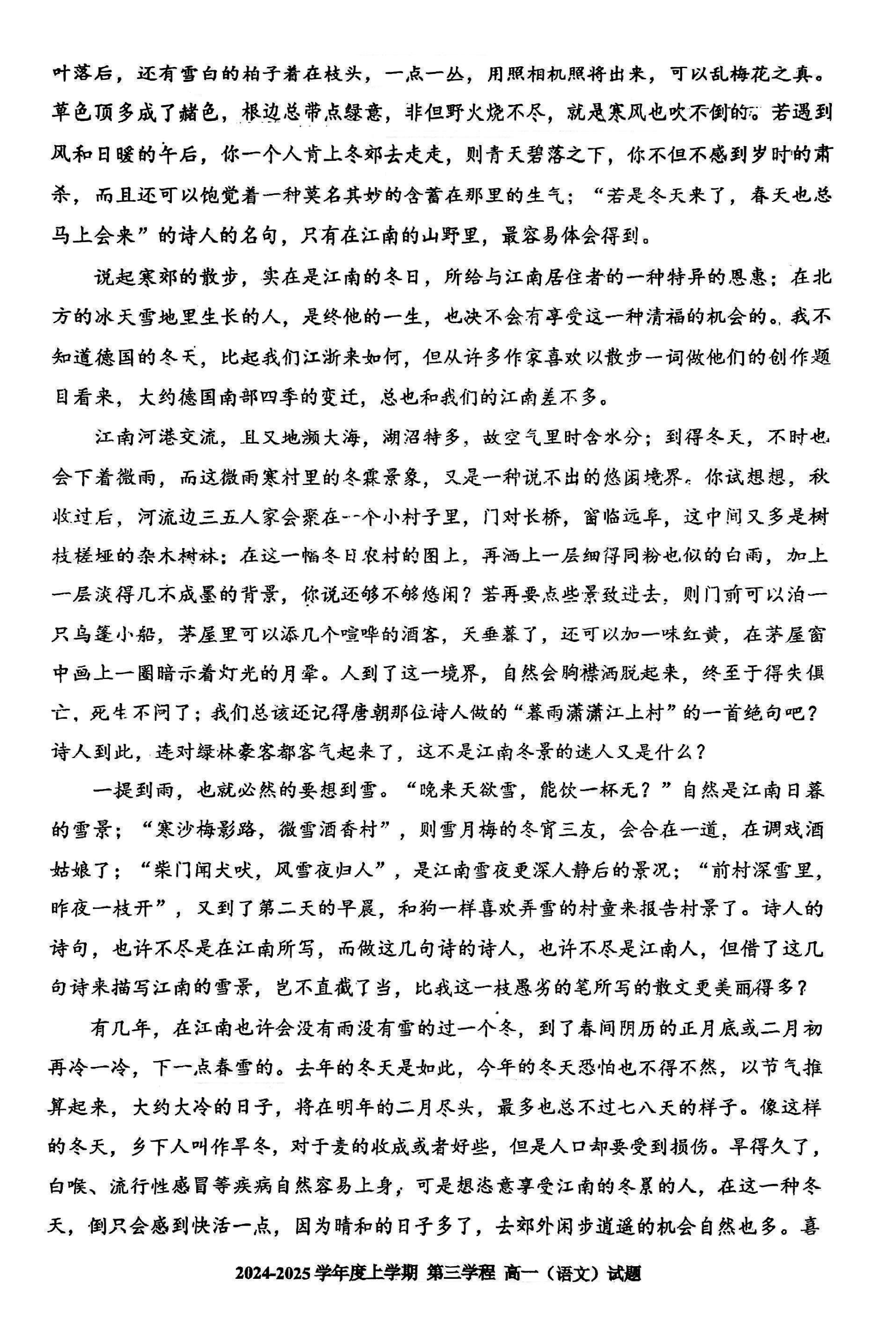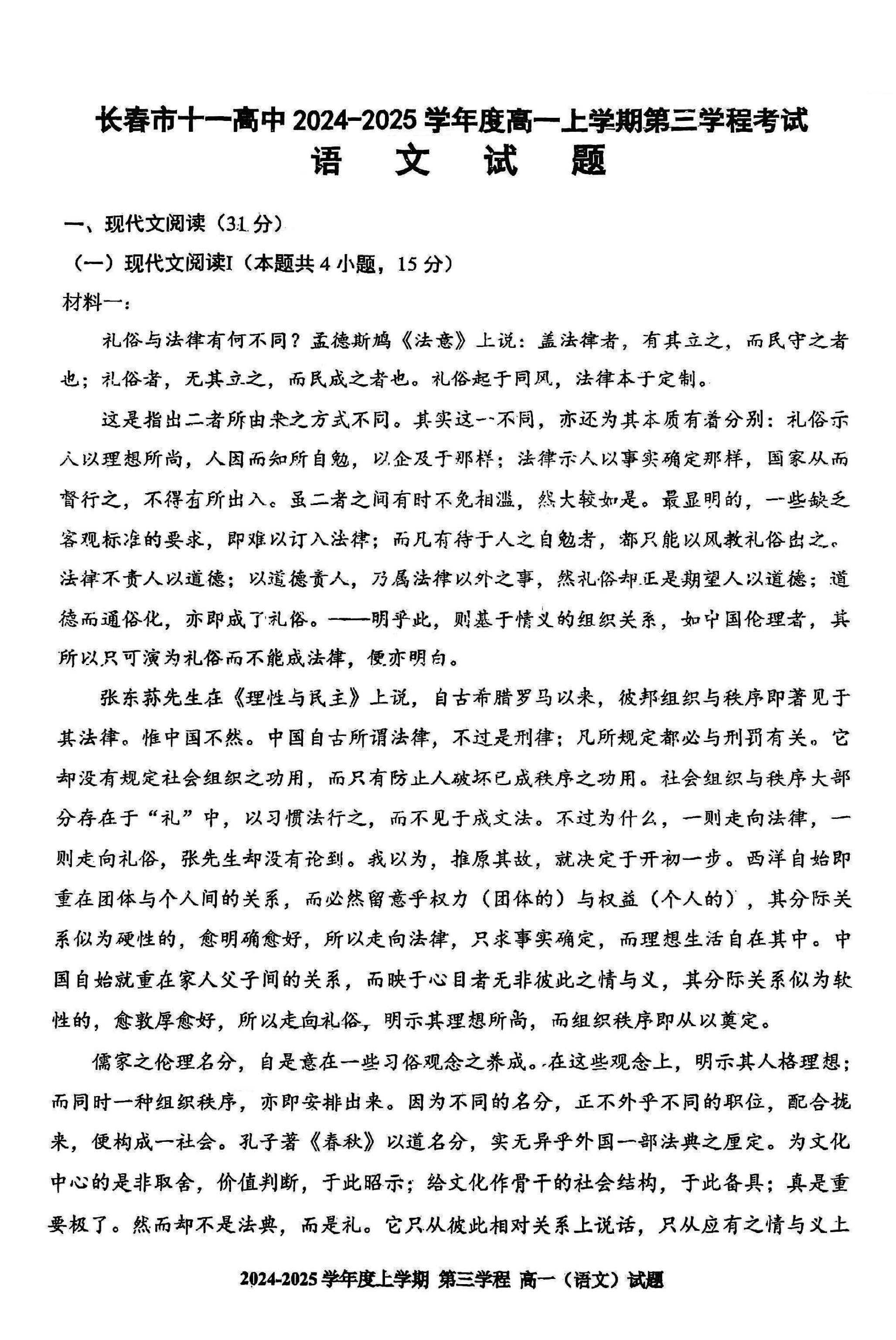 长春十一高中2024-2025学年高一上学期第三学程考语文试题及答案