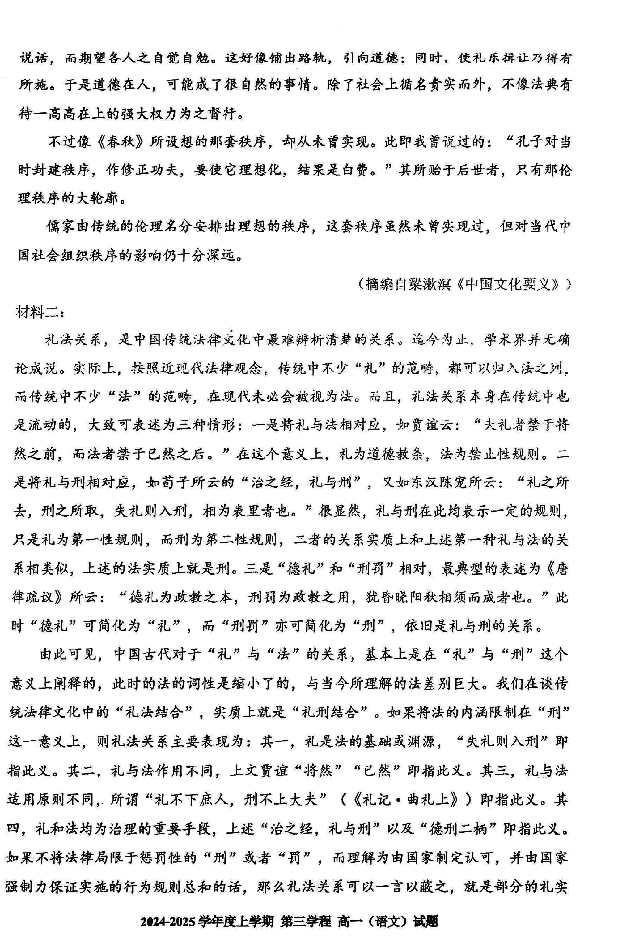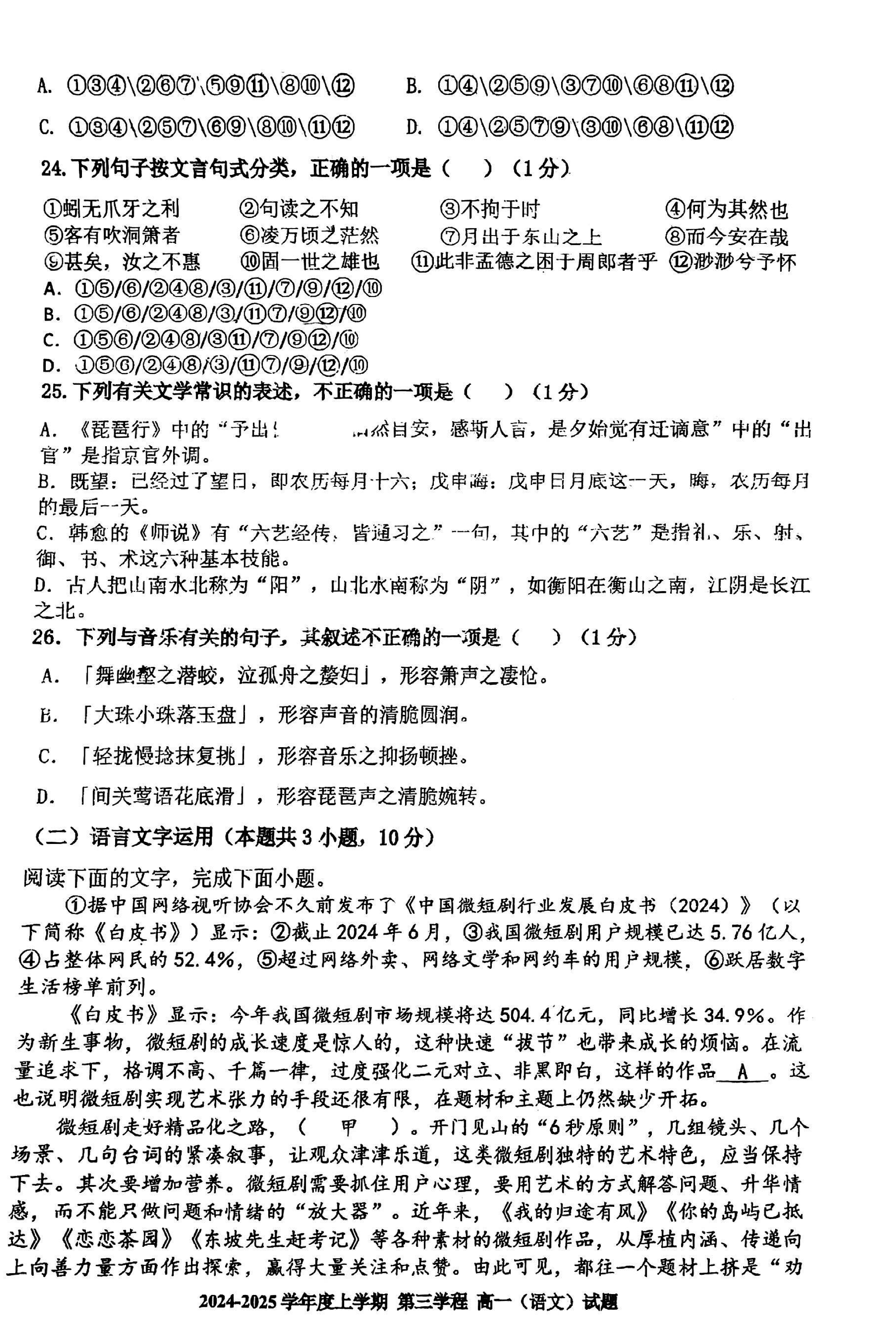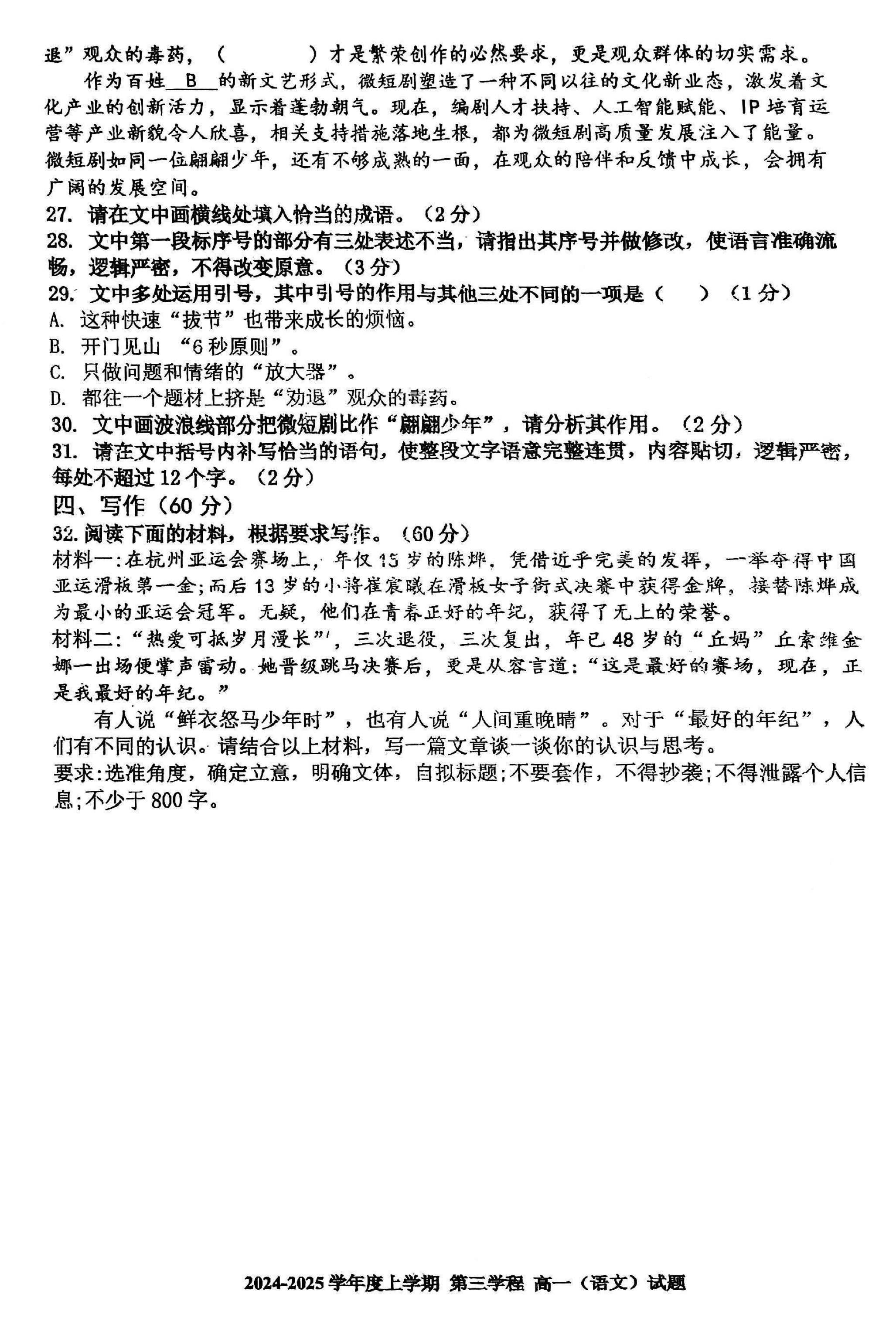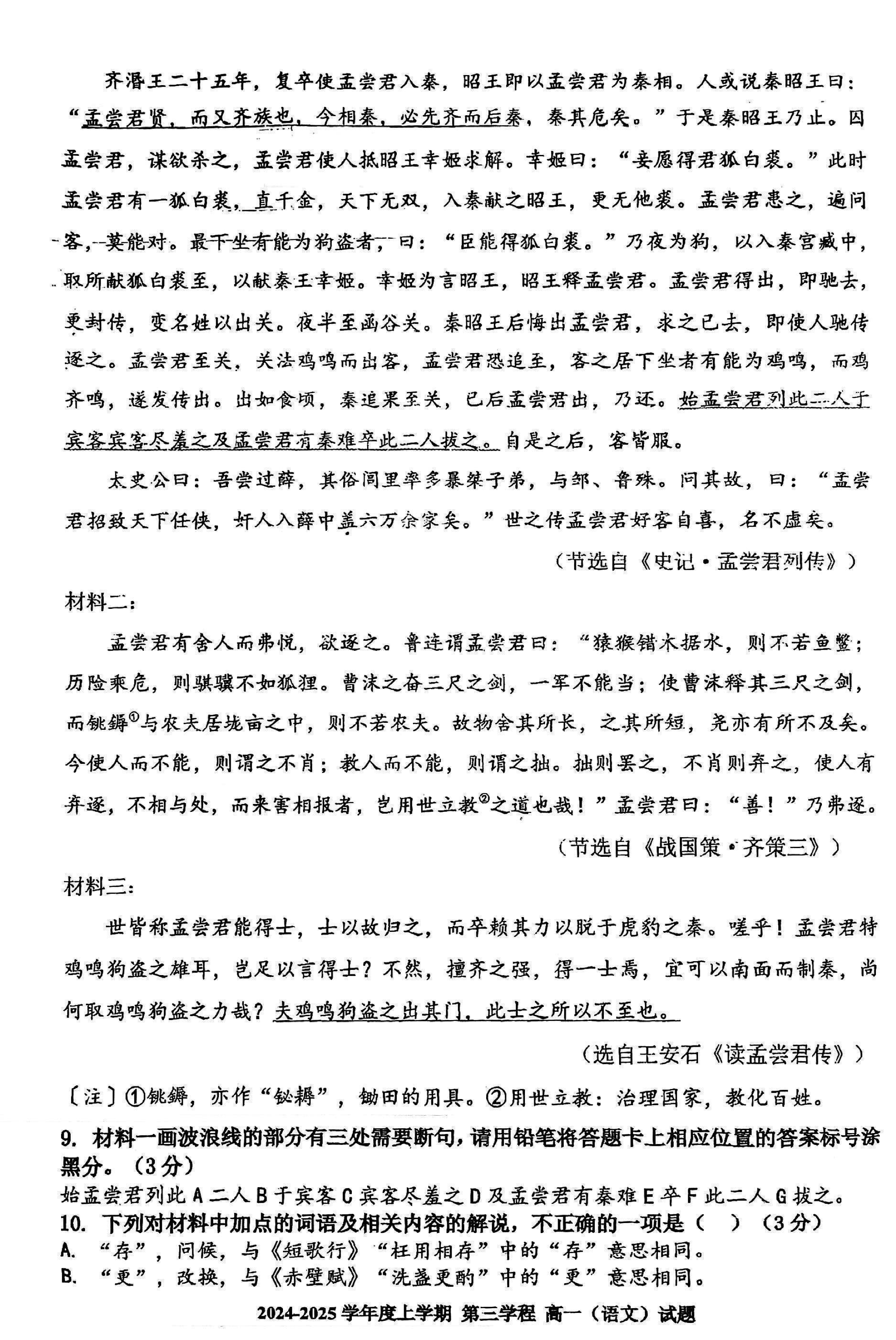 长春十一高中2024-2025学年高一上学期第三学程考语文试题及答案