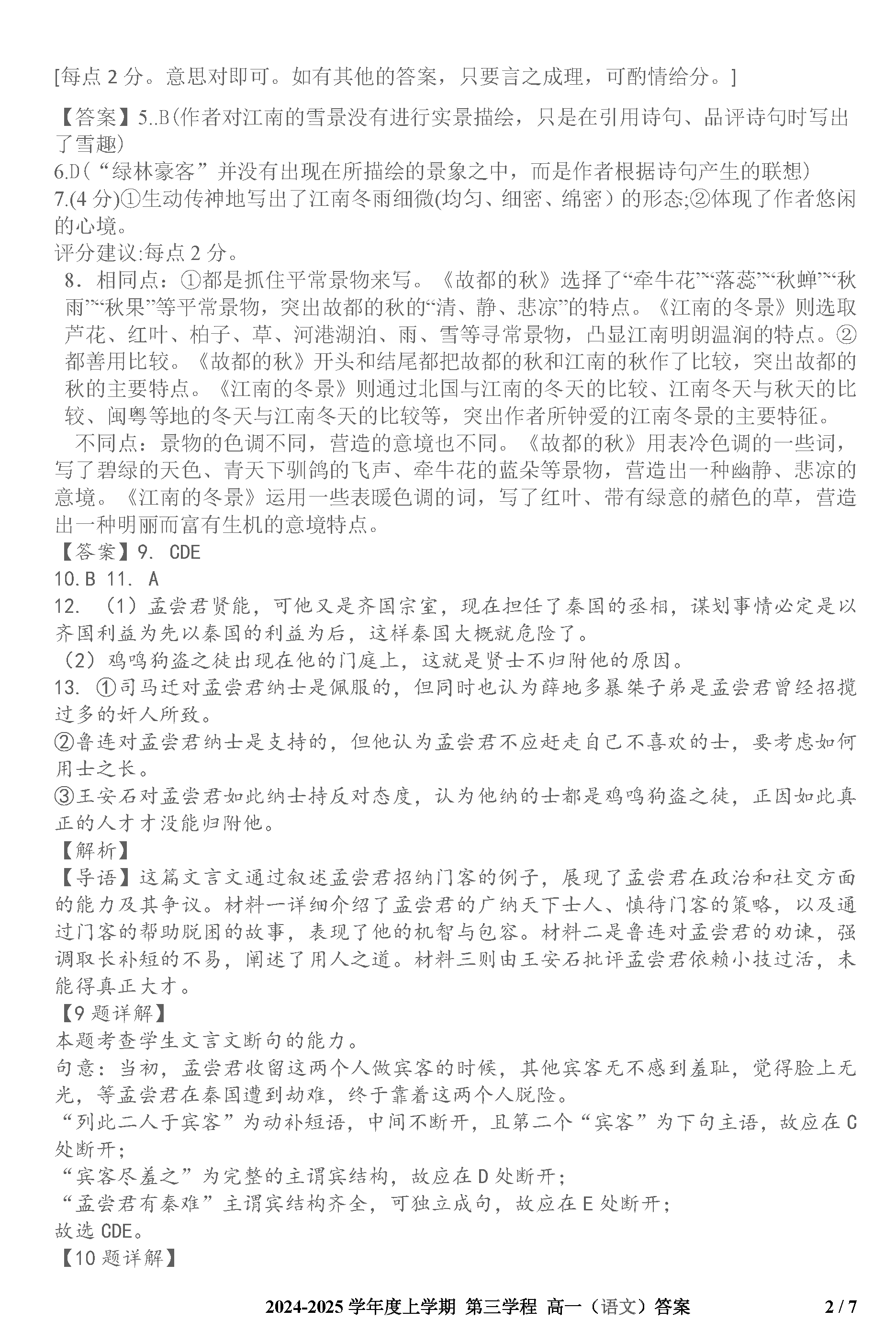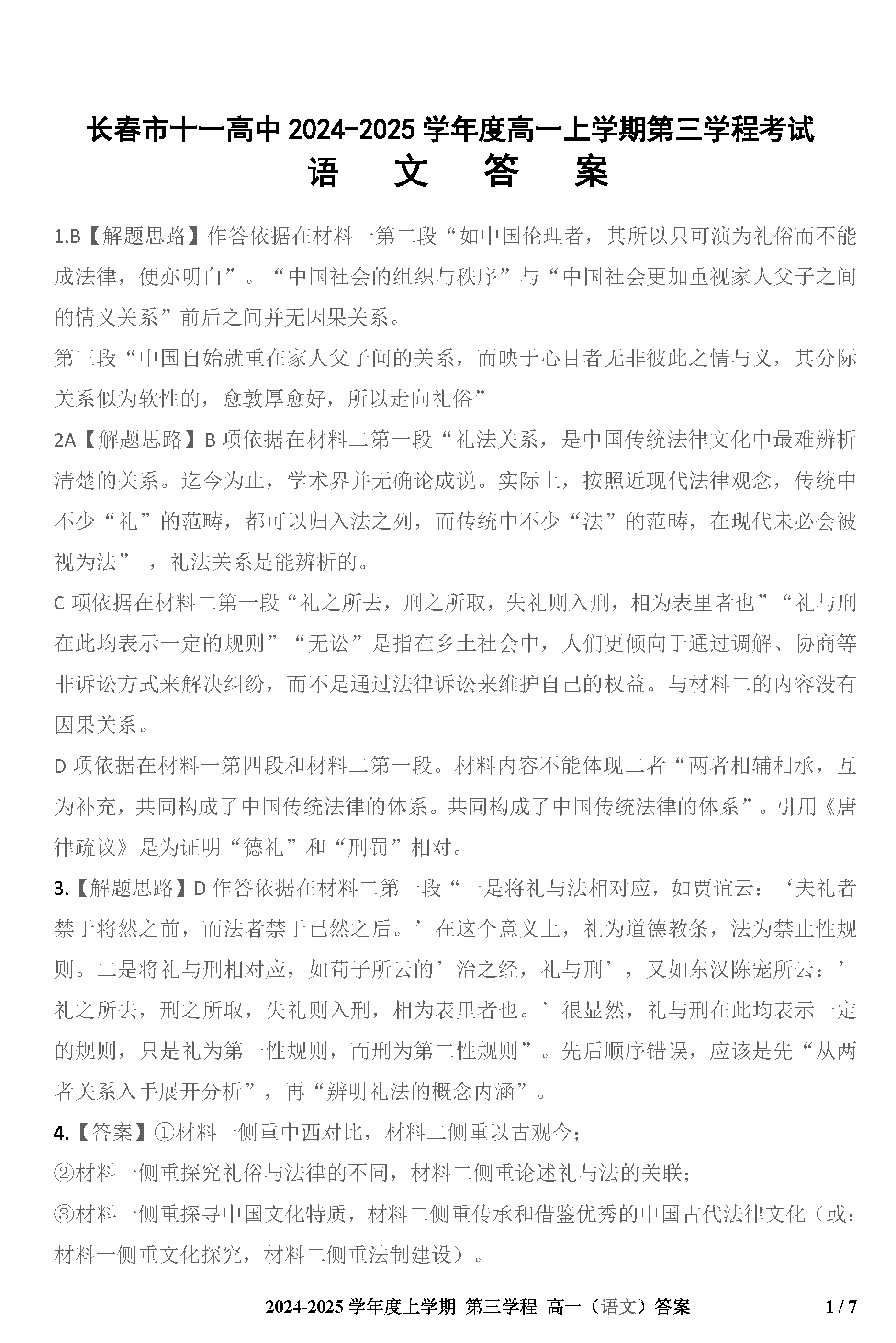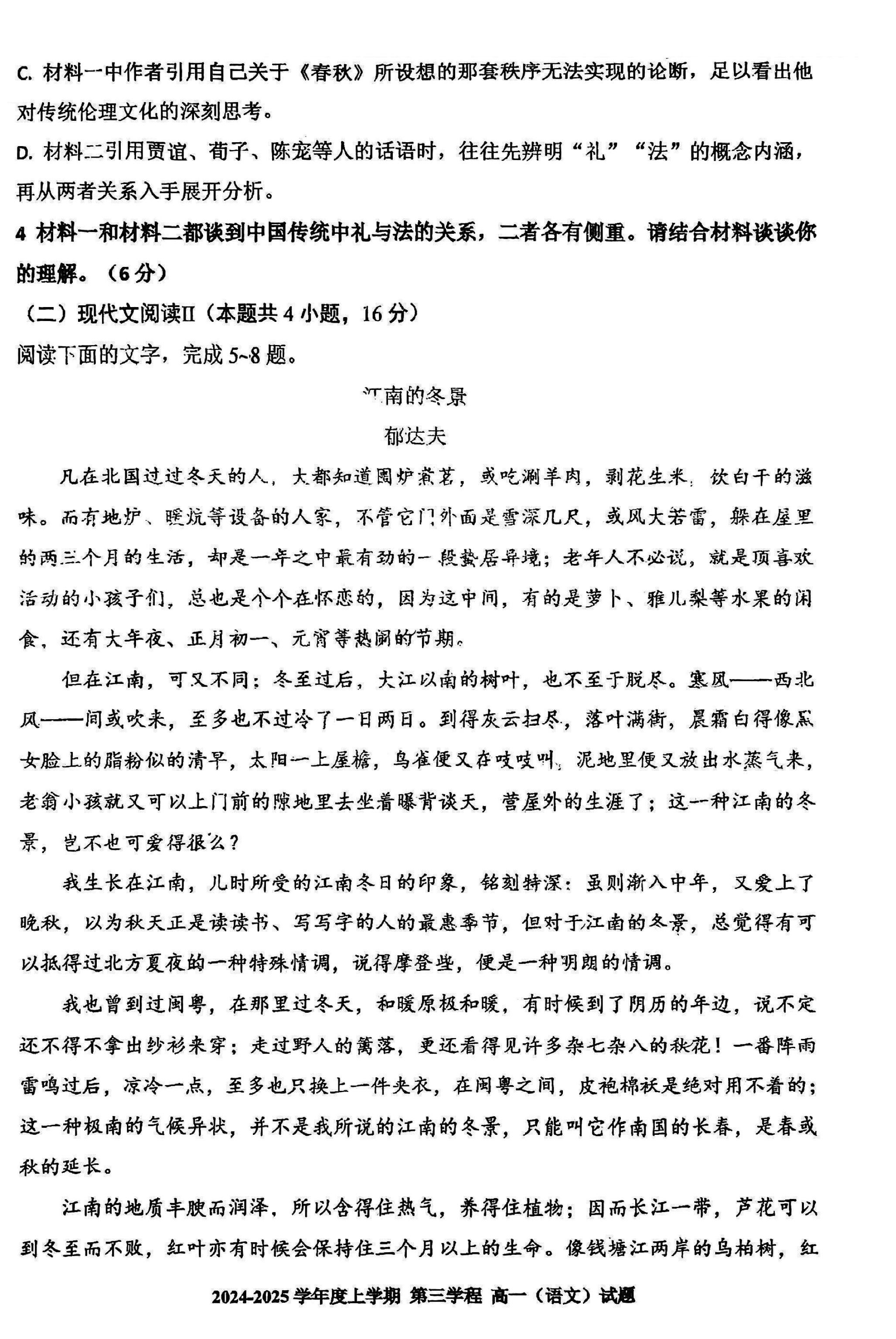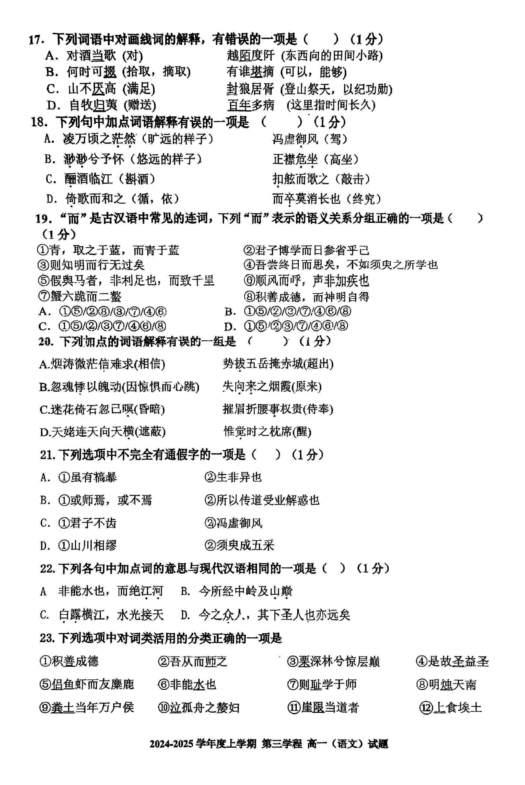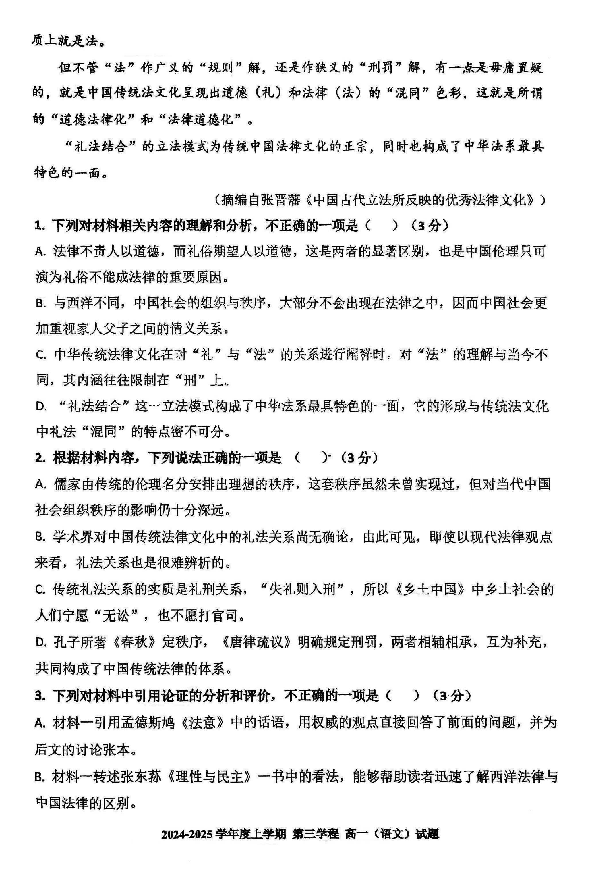长春十一高中2024-2025学年高一上学期第三学程考语文试题及答案