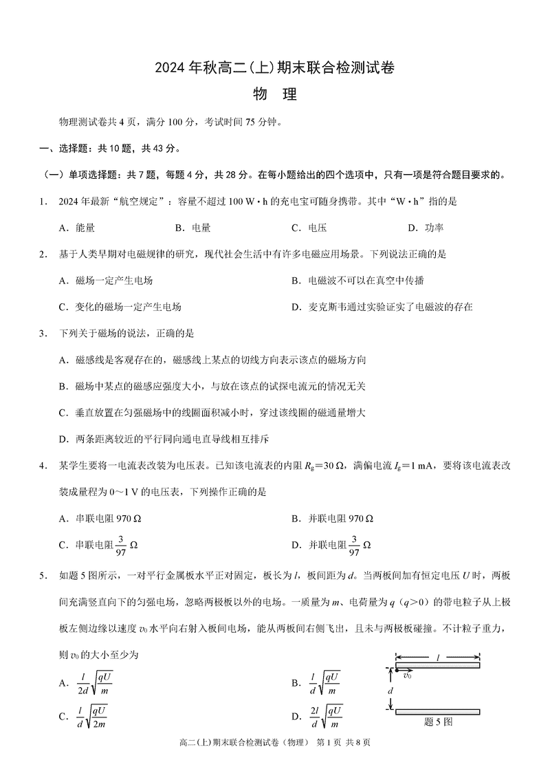 重庆康德2024年秋高二上学期期末物理试题及答案 时间:2025-01-27 重庆 高中物理 重庆康德2024年秋高二上学期期末物理考试已于近日开考,为方便考生考后及时查看考试情况,查漏补缺、弥补不足,本文整理了试题答案解析相关信息! 物理试题及答案解析
