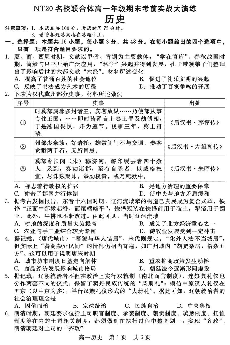 邯郸NT20名校联合体2024-2025学年高一上学期期末考前实战大演练历史考试已于近日开考,为方便考生考后及时查看考试情况,查漏补缺、弥补不足,本文整理了试题答案解析相关信息!