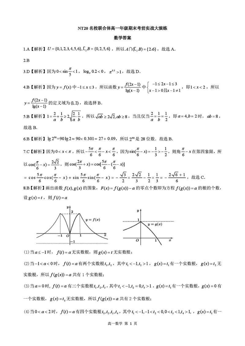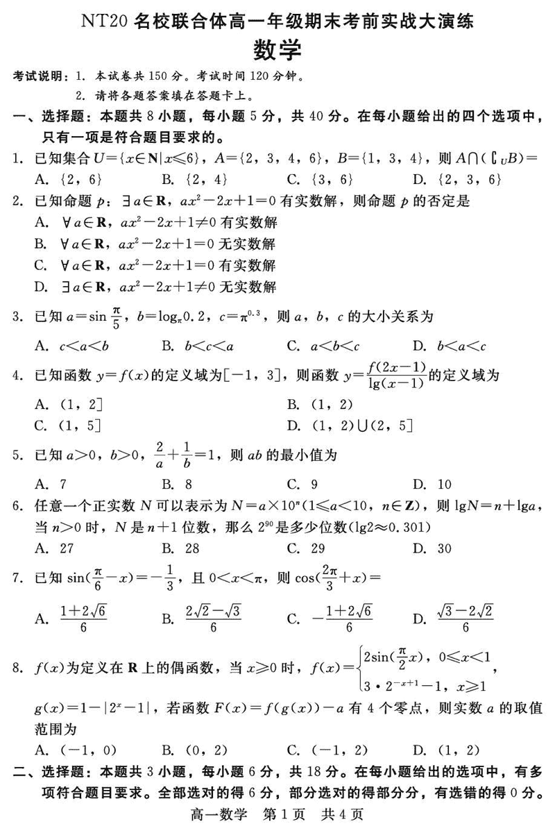 邯郸NT20名校联合体2024-2025学年高一上学期期末考前实战大演练数学试题及答案