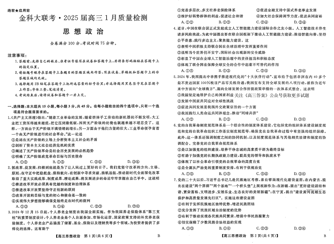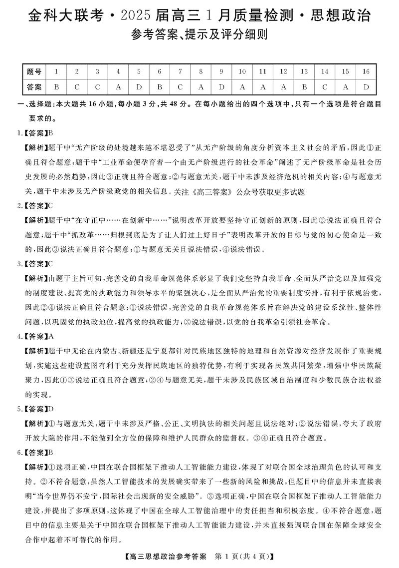 山西省金科大联考2025届高三1月质量检测政治试题及答案 时间:2025-01-27 山西 高中政治 山西省金科大联考2025届高三1月质量检测政治考试已于近日开考,为方便考生考后及时查看考试情况,查漏补缺、弥补不足,本文整理了试题答案解析相关信息! 政治试题及答案解析