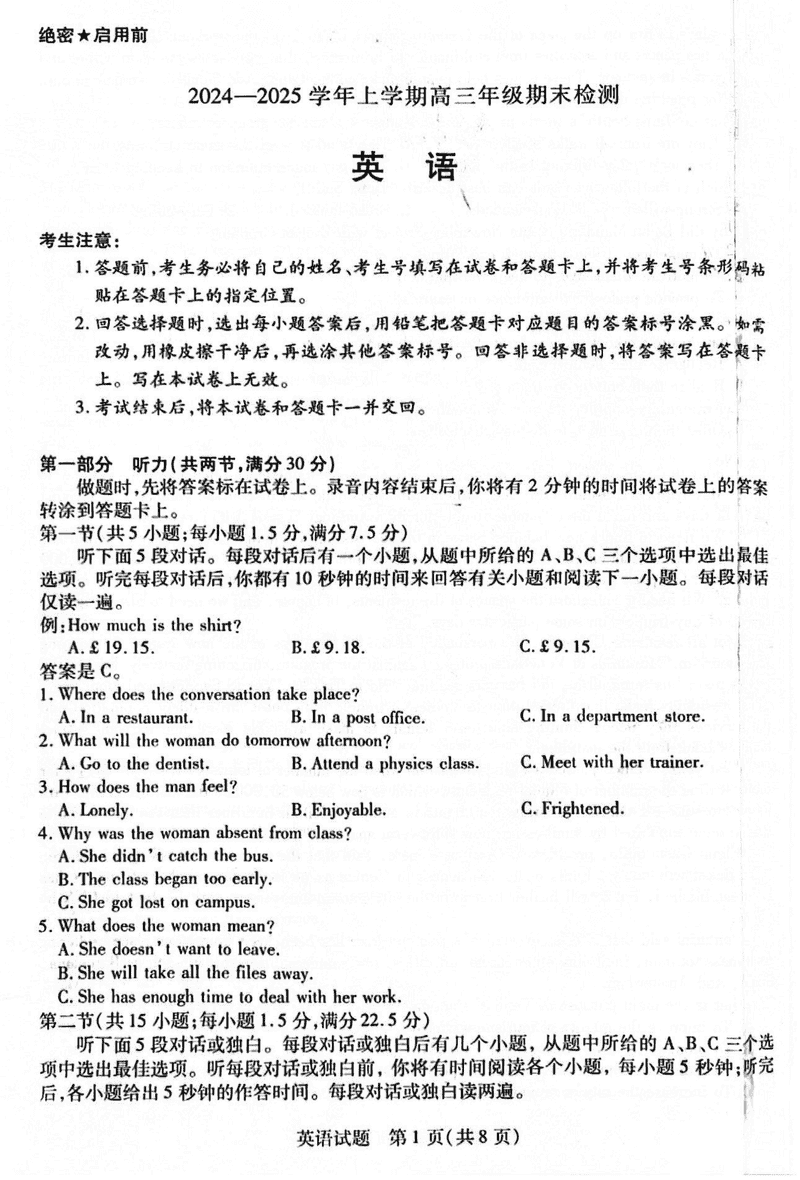 安徽天一大联考2025届高三上学期1月期末检测英语考试已于近日开考,为方便考生考后及时查看考试情况,查漏补缺、弥补不足,本文整理了试题答案解析相关信息!
