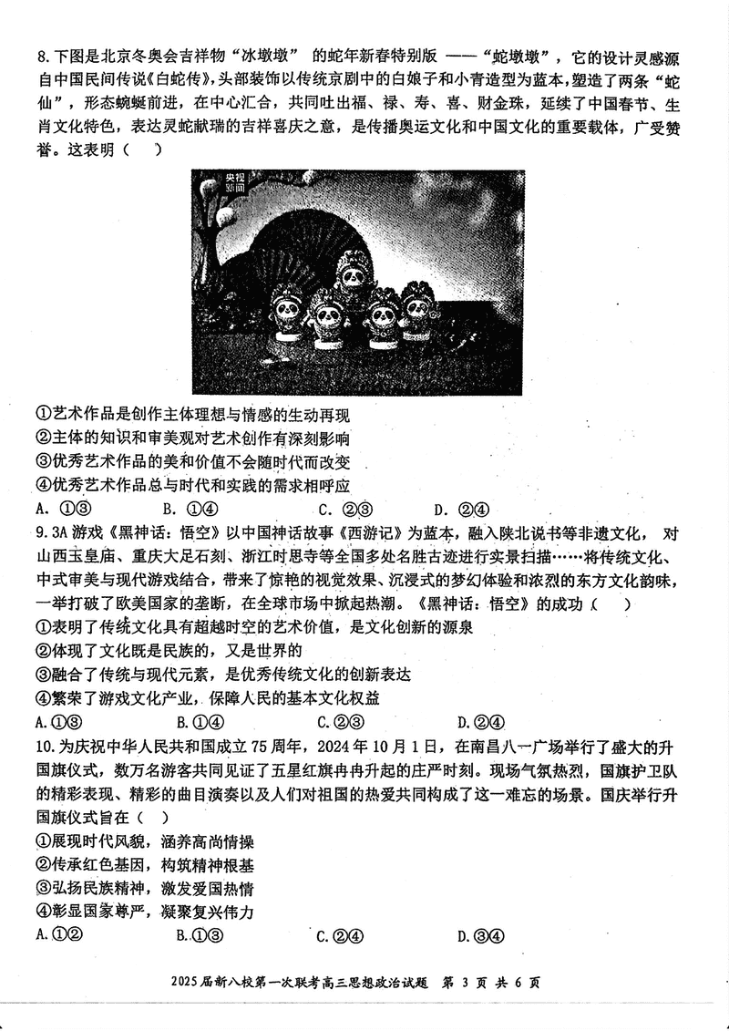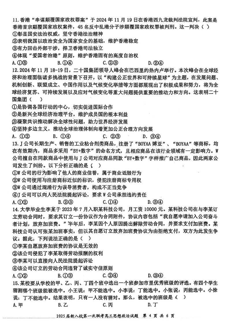 江西省新八校2025届高三第一次联考政治试题及答案 时间:2025-01-27 江西 文综试题 江西省新八校2025届高三第一次联考政治考试已于近日开考,为方便考生考后及时查看考试情况,查漏补缺、弥补不足,本文整理了试题答案解析相关信息! 汇总:江西省新八校2025届高三第一次联考试题及答案汇总 政治试题及答案解析